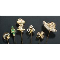 A group of six gold and gem stick pins, comprising; a carved green chalcedony pin decorated with floral swags, a straw hat decorated with small diamonds, a goblet entwined with a diamond snake, a diamond shamrock, and two seed pearl and diamond floral pins