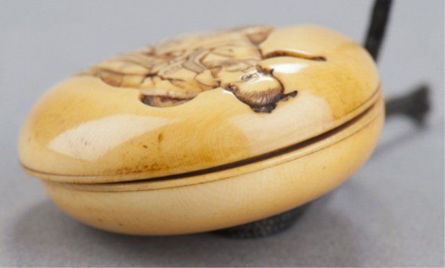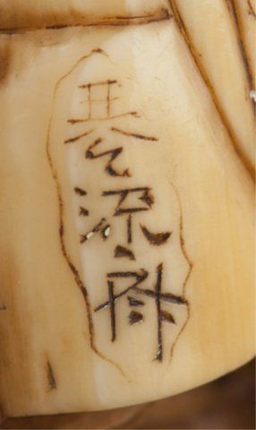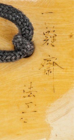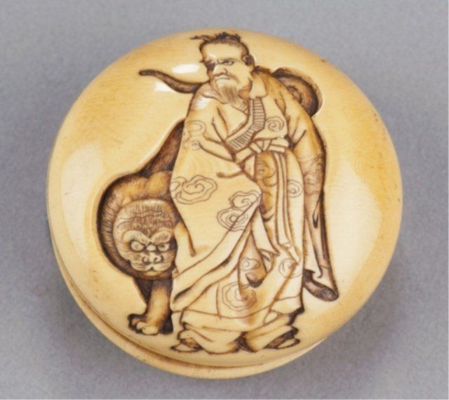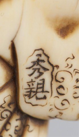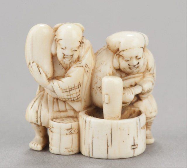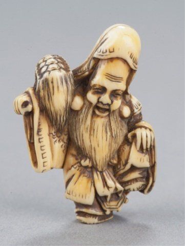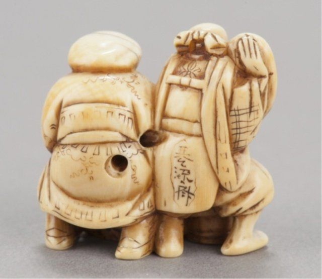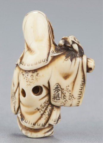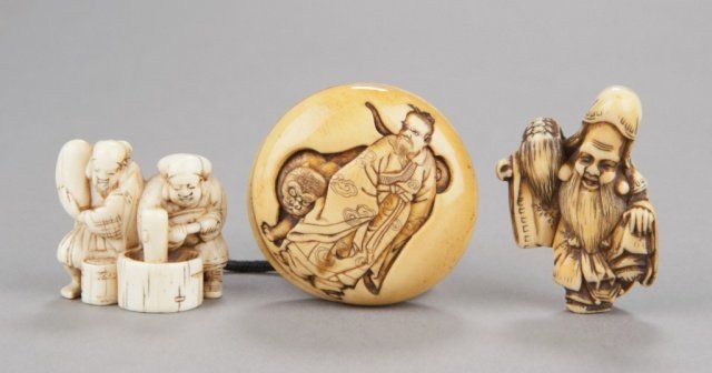 Tokyo, Mid 19th century. , Mid 19th century. The first, attributed to Tadatane, Daikoku and a bearded Ebisu, Daikoku wields the pounder while Ebisu carries a sack of rice over his shoulder. The ivory is white on the front and nicely patinated on the back. Signed on Ebisu?s back in an irregular torpedo shaped reserve, Tadatane. 1?in (4.5cm). The second, by Ikkeisai Hogyoku, depicting a Sage, and tiger. Signed on the reverse, Ikkeisai Hogyoku, plus a kakihan, worn. 1?in (4.5cm). The third, attributed to Hidechika II, of Jurojin with a minogame (head missing) climbing over his shoulder. Signed in an irregular cartouche, Hidechika. 1?in (3.2cm). Provenance: The first, Christie's, London, October 9, 1973; Lot 181. The second, Sotheby's, London, July 30, 1968; Lot 393.