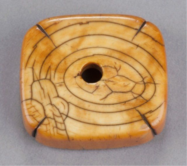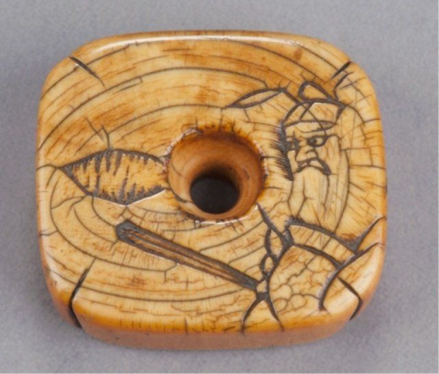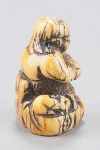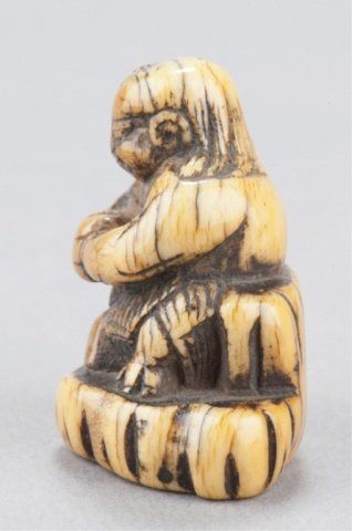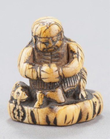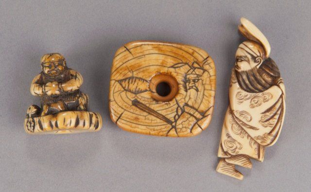 Early/mid 19th century. The first, a monk-like stocky figure with bald pate but long locks seated on a plinth with a small animal(tiger?) lying at his right side. This may represent Hattara Sonju with his white tiger attribute. 1 3/8in (3.6cm). The second, a manju of mammoth ivory bearing an engraved design of Shoki holding his sword in front of him, the reverse an outline of an Oni. 1 3/4in (4.3cm). The third, Shoki standing on one foot, his long beard highlighted with sumi ink, eyes inlaid in black, his hat of Chinese imperial origin. 2 7/8in (7.2cm).