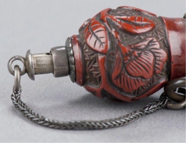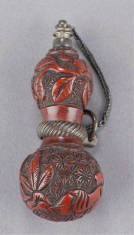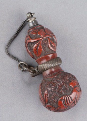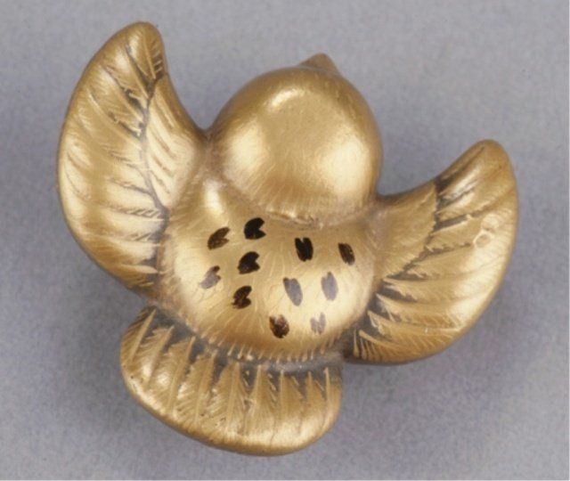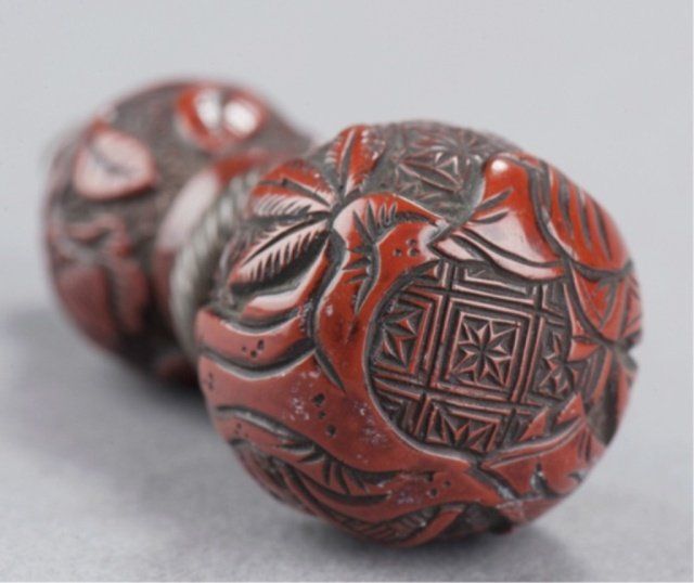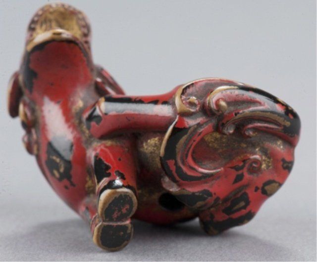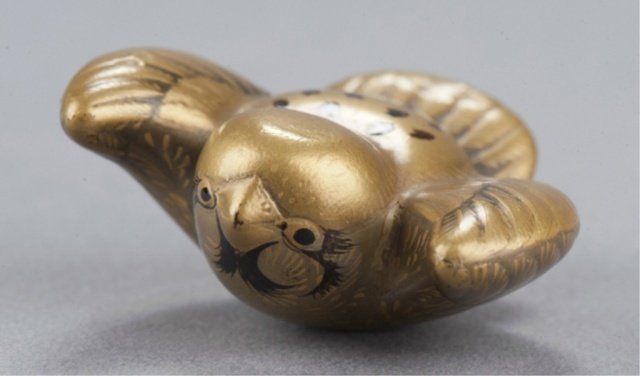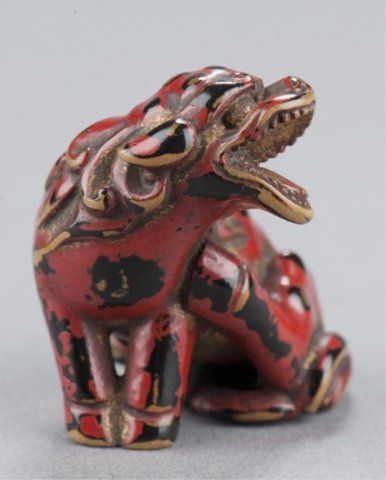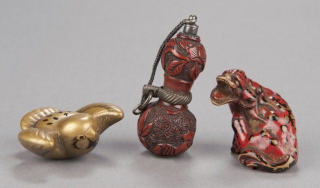 Early/Mid 19th century. The first, a matte gold sparrow, the featherwork with highlights in brown lacquer. 1 3/4in (4.4cm). The second, tsuishu of an elongted gourd showing two Chinese in a garden setting. 2 3/8in (5.9cm). The third, negoro of a Kirin rampant with gold highlights. 1 1/2in (3.8cm). Provenance: The third, Purchased from Raymond Bushell 1957. The third, Exhibited: the Student Center (August 29 - September 25, 1960)