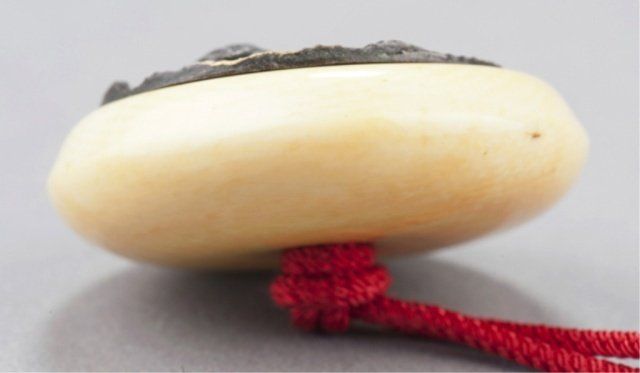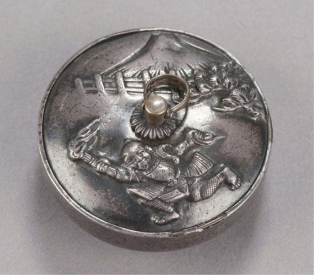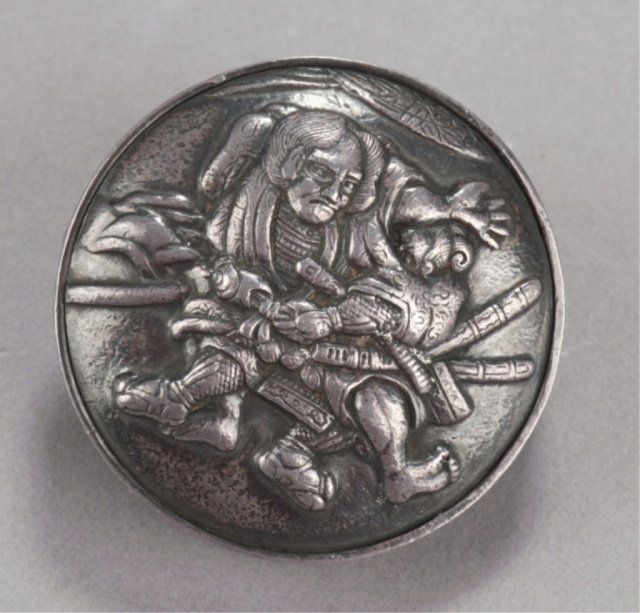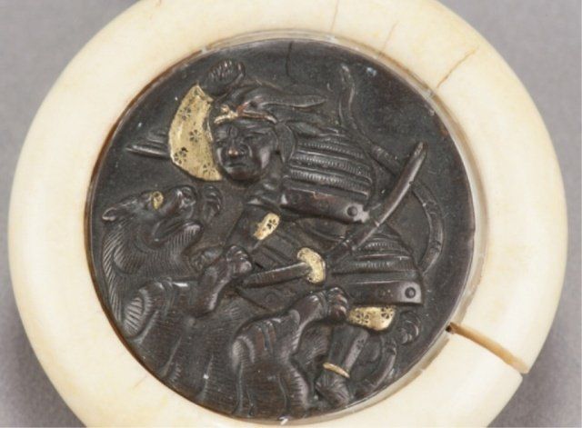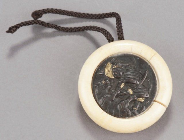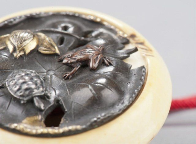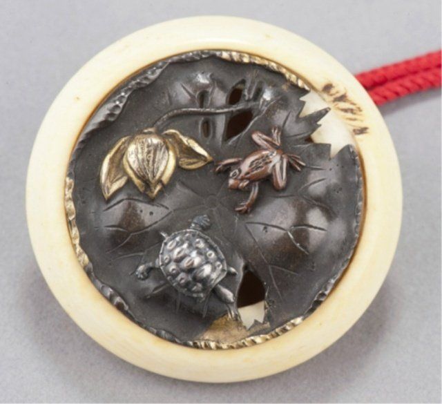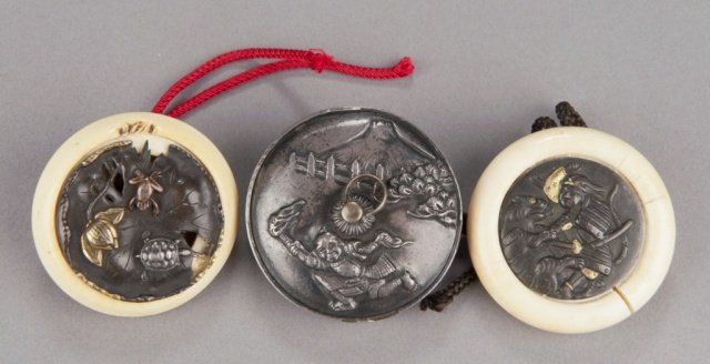 Mid/late 19th century. The first, kagamibuta with a shibuichi lotus pad with leaves, with gilt lotus pod, copper frog and silver turtle, in an ivory bowl. 1 3/4in (4.5cm). The second, manju with two deeply cast sides that are connected by a wide band, depicting the story of the Soga Brothers, the obverse likely shows Juro with his hand on the waistband of his brother Goro. 1 7/8in (4.8cm). The third, kagamibuta with a shibuichi disc with gilt detailing of Kiyomasa slaying the Tiger, in an ivory bowl. 1 7/8in (4.7cm). Provenance: The first, Sotheby's, London, July 30, 1968; Lot 121.