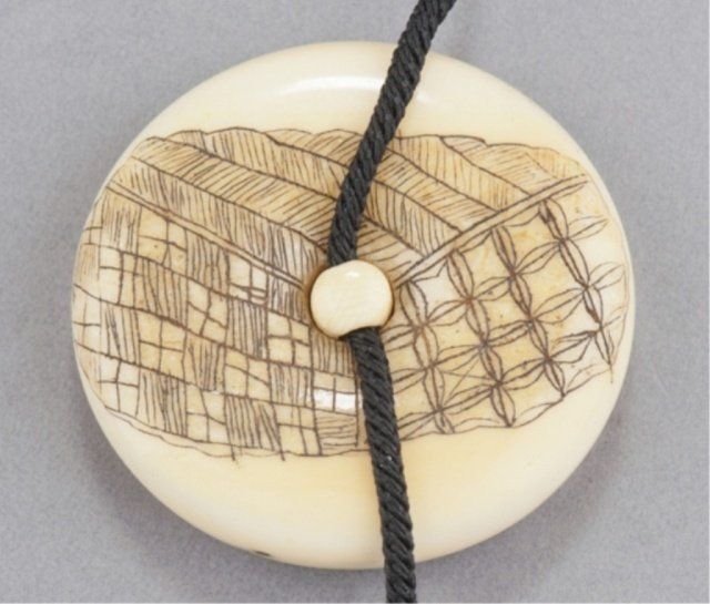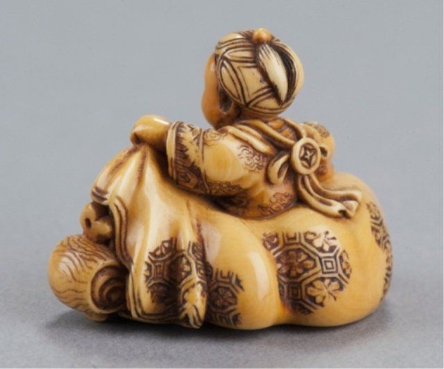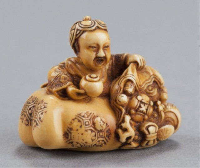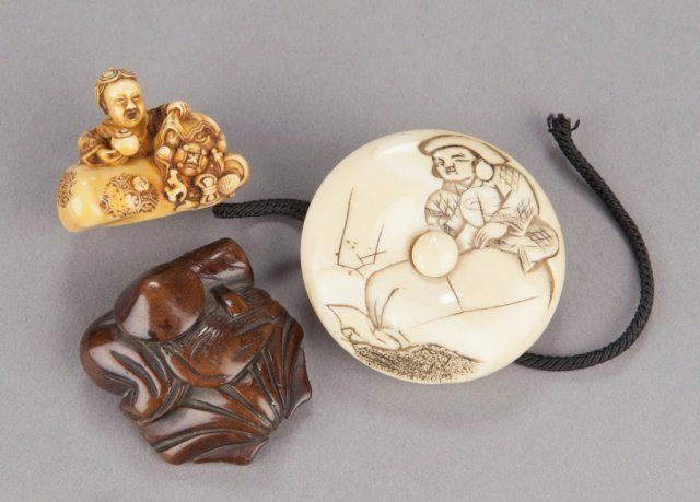 The first, mid 19th century, ivory Daikoku sitting astride his bag of treasures. He holds aloft a large tama with his right hand while his left holds open his treasure sack. 1 1/8in (2.9cm). The second, late 18th century, wood Daikoku with his mallet and treasure sack, sleeping face down on a clam shell. 7/8in (2.1cm). The third, early 19th century, walrus ivory manju showing Daikoku sitting atop his treasure sack, the reverse has wide band of a diaper pattern that covers the entire inner dentine of the ivory. 1 7/8in (4.9cm).