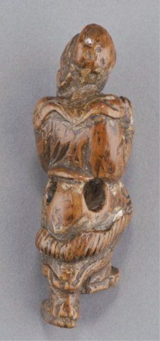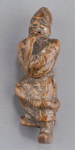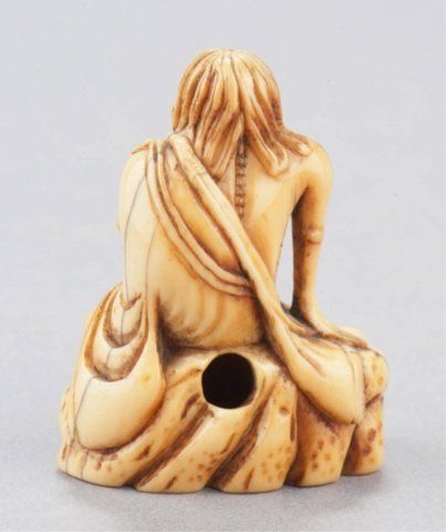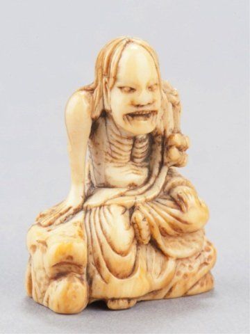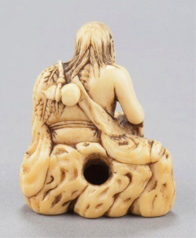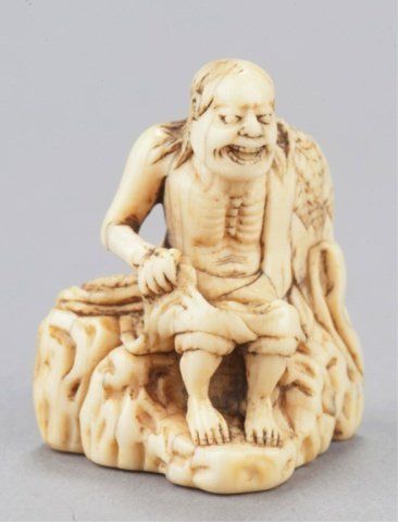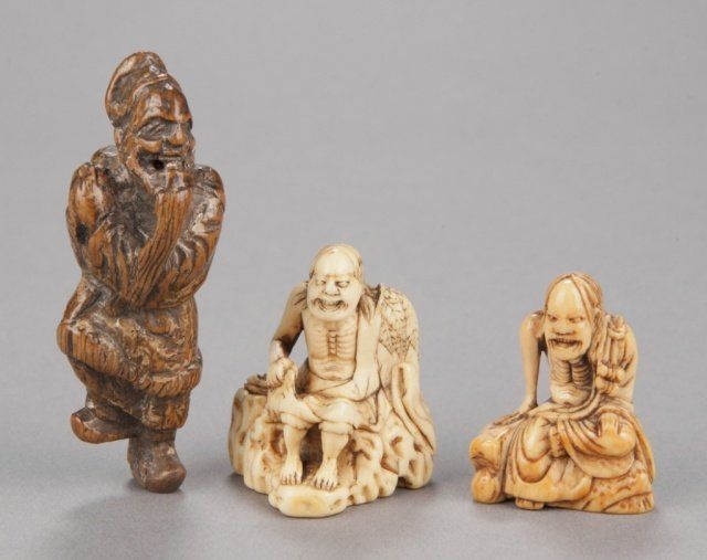 The first, a Soken Kisho style figure of a sage standing on one leg and stroking his beard. 3 1/8in (8cm). The second, ivory Sennin on a rock, the upper part of his robe lies across his lap revealing his emaciated chest. 1 5/8in (4.1cm). The third, ivory Sennin sitting on a rock, well-worn with some damage, the right arm has been repaired. 1 3/4in (4.5cm). Provenance: 18th century.