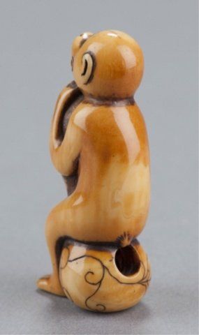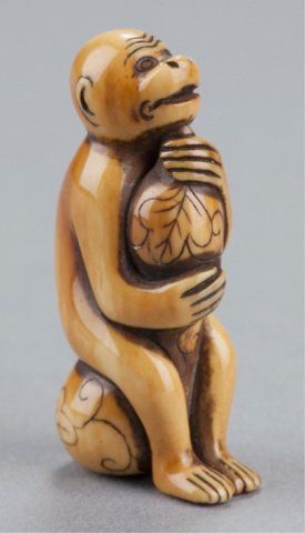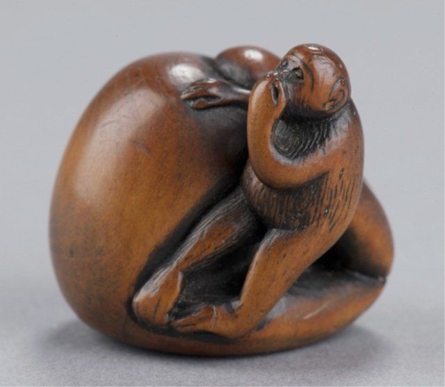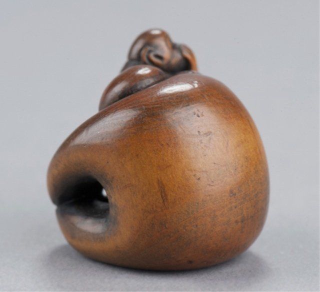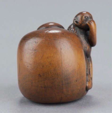 Late 18th/early 19th cent The first, late 18th century, in ivory, straddling a large gourd. 1 7/8in (4.9cm). The second,early 19th century, in wood, with a Ningyo Doll, standing on a leg of the doll and leans against it with his right arm while holding his left hand to his mouth as if eating a piece of fruit. 1 1/4in (3.3cm).The third, late 18th century, in kaki wood, laying on a folded leaf. 2 1/8in (5.5cm).