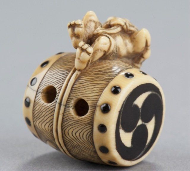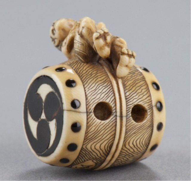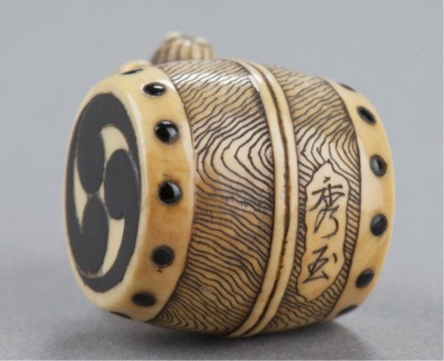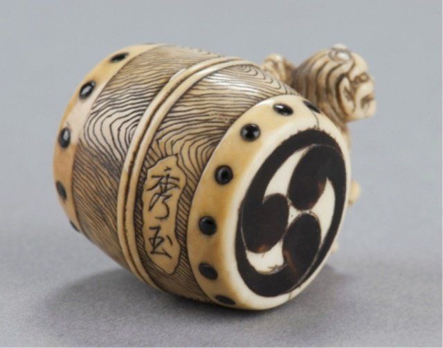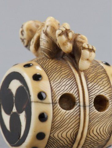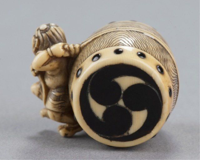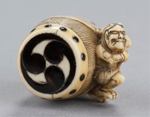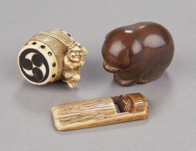 Tokyo, Mid 19th century. , Mid 19th century. The first, ivory depicting Oni carrying barrel on back. The Tomoye on both ends of the drum and the bosses around the end strips are inlaid in tortoise-shell. Inscribed in wavy reserve, Shugyoku. 1in (2.5cm). The second, attributed to(or school of) Tomochika, Corozo nut (Tagua) depicting a puppy, eyes inlaid in black. Signed on the rear in an irregular boat-shaped reserve, Tomochika. Purchased from Ray Bushell who designated the artist as Tomochika. 1?in (3cm). The third, attributed to Tomochika 3rd, ivory depicting a carpenters plane, lightly stained and carved to resemble bone, missing the blade which is usually in ebony. Signed without reserve, Tomochika. 1?in (4.5cm). Provenance: The first, Purchased from R. Koscherak, 1951. The second, Purchased from Raymond Bushell 1960.