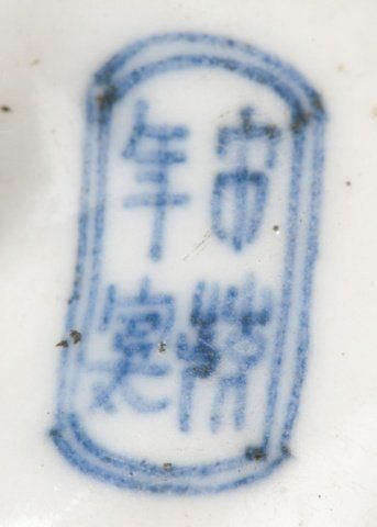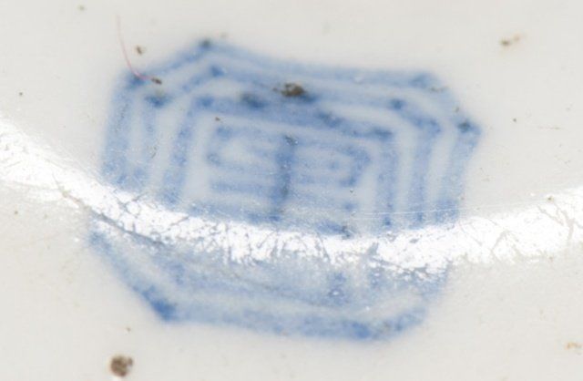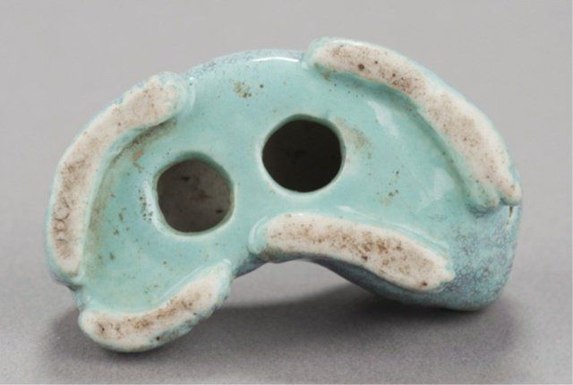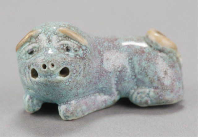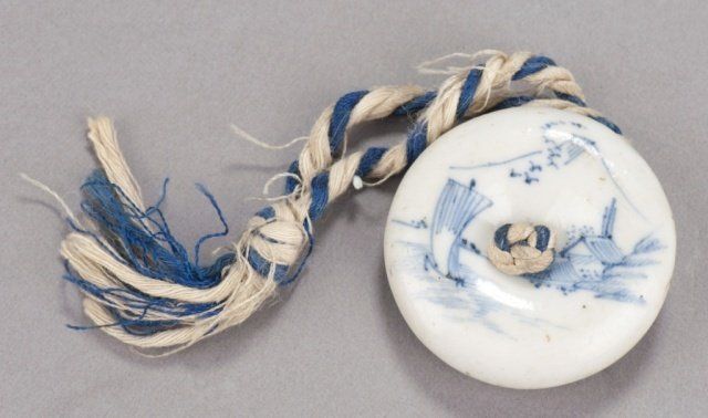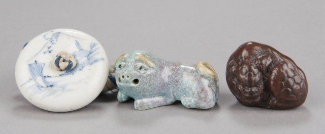 Mid 19th century. The first, a porcelain manju, decorated in underglaze blue with a design of a flock of birds coming over a mountain, the back with two seals. 1 3/4in (4.4cm). The second, a Chinese porcelain chin dog with a blue souffle glaze. 2in (5.2cm). The third, by Bizen, of a pottery reclining shishi. Provenance: The third, Purchased at Yagi art shop in Kyoto, Japan, 1960.