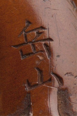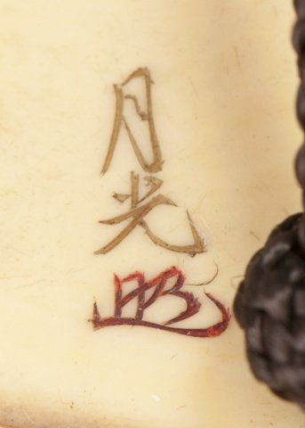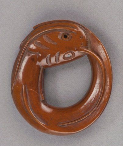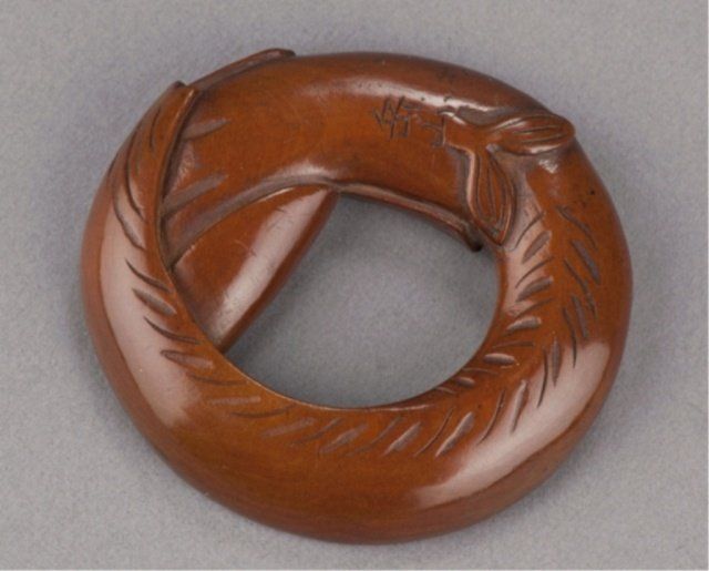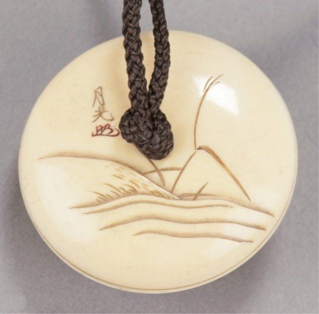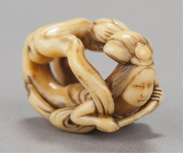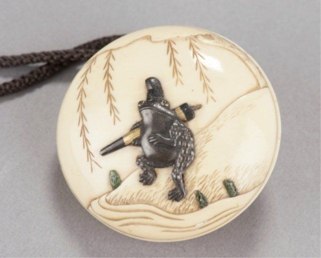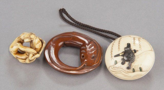 Mid/late 19th century. The first, ivory of a flying Tennin, her body curled backwards so that the feet form a circle. Signed Gensai. 1 1/2in (3.9cm). The second, wood of a catfish forming a circle of itself. Signed just where the tail begins to show, Gakuzan. 2 1/8in (5.5cm). The third, an ivory manju representing the well-known story of Ono no Tofu, engraved with a willow tree under which sits a shakudo image of a frog. Signed on the reverse, Gekko, plus kakihan. 1 3/4in (4.4cm). The first, Exhibited: the Student Center (August 29 - September 25, 1960)