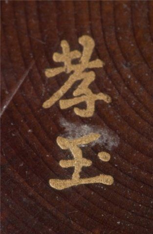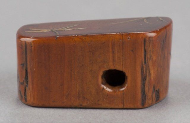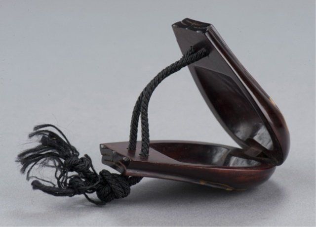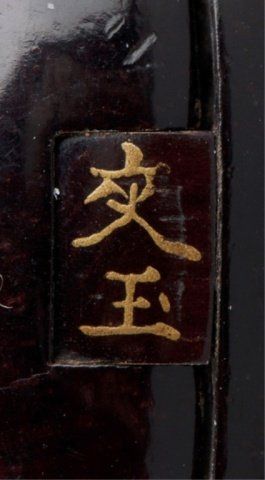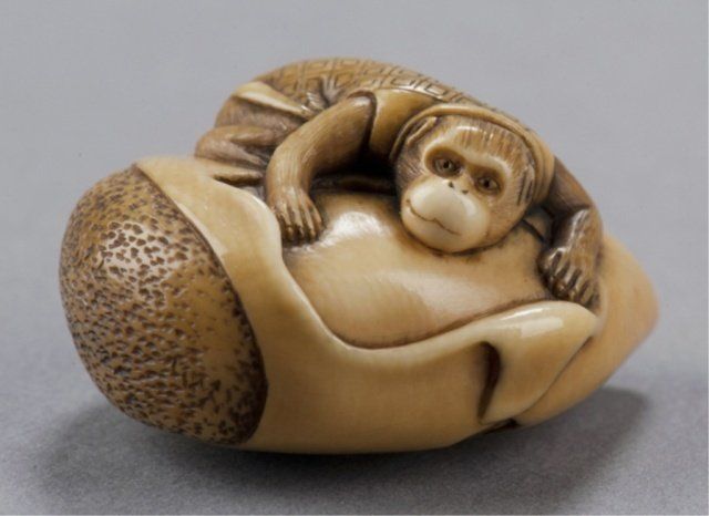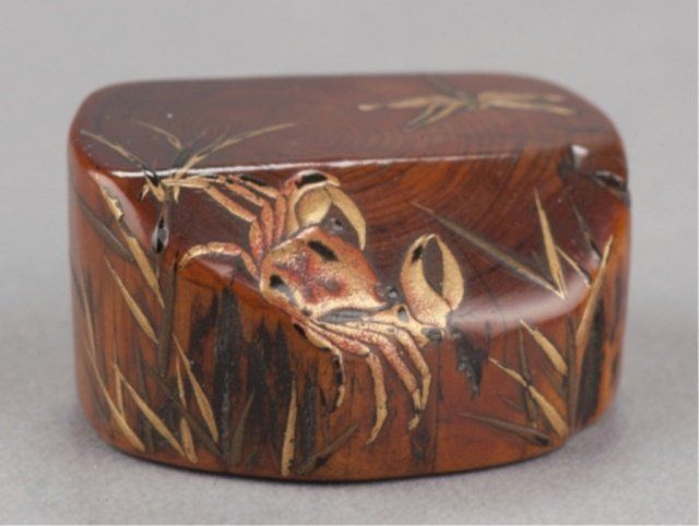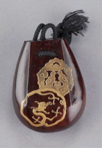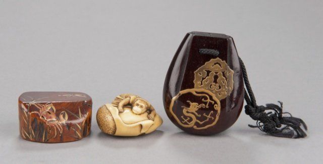 19th century. The first, wood simulating a tree stump, lacquered in gold and red takamakie with a crab, dragonfly, and reeds. Signed on the underside in gold lacquer, Kogyoku. 1 5/8in (4cm). The second, an ivory monkey straddling a chestnut. Signed in oval reserve, Korin. 1 1/2in (3.9cm). The third, a wood kinchaku, having gold lacquer rain dragon and clouds. Signed on the hinge, Kogyoku. 2 1/4in (5.7cm). Provenance: The first, Sotheby's, New York, September 21, 1983. Sotheby's , London, October 23, 1972; lot 171. Illustrated in Lazarnick, page 637.