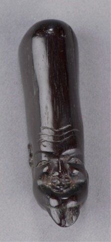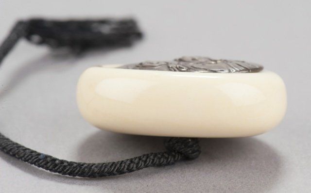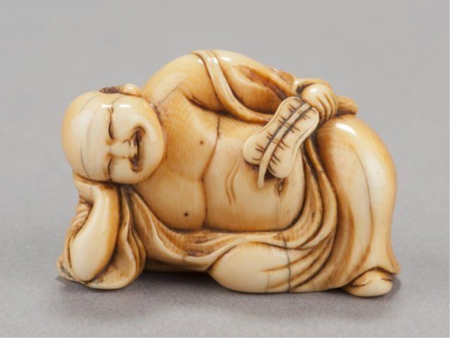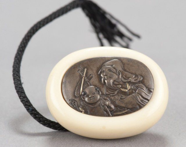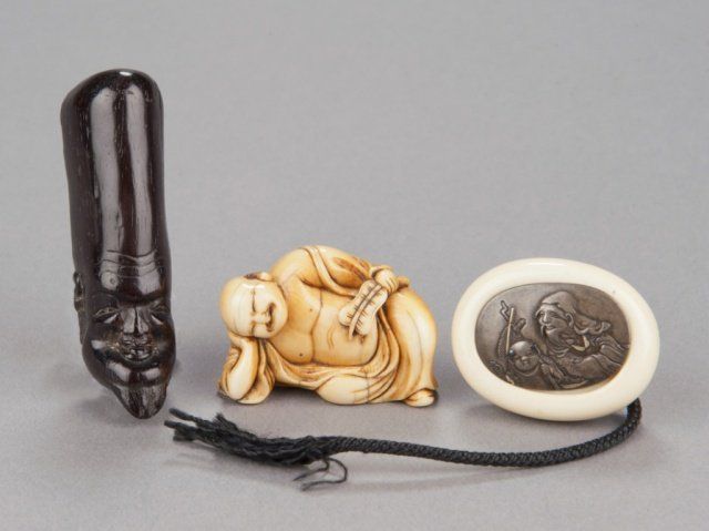 19th century. The first, wood head of Fukurokuju in a streaked black wood, possibly kaki. 2 5/8in (6.8cm). The second, an ivory figure of a reclining Hotei, leaning on his upturned right hand with an uchiwa fan in his left hand. 1 5/8in (4.1cm). The third, a kagamibuta of ivory set with shibuichi disc depicting Jurojin accompanied by a karako who carries a staff over his shoulder to which is attached Jurojin's uchiwa fan, details in gold and shakudo. 1 1/2in (3.9cm).