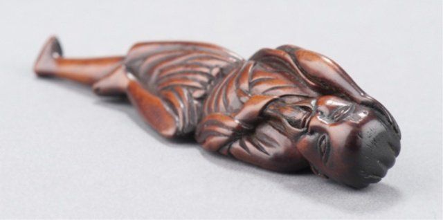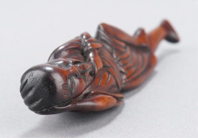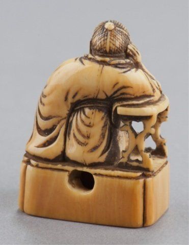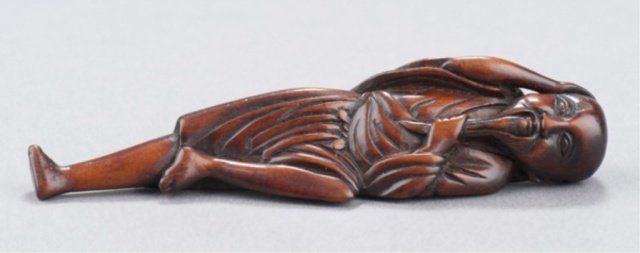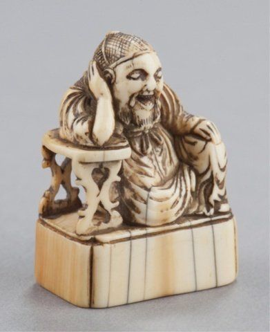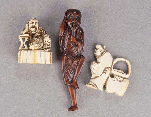 The first, late 18th century, an ivory carving of a Chinese gentleman seated on a thick seal-type base, his right arm rests on a tabouret. 1 3/4in (4.3cm). The second, late 18th century, figure in wood of a Chinese man standing on one leg with his right hand on top of his head and the other holding his wispy beard. 3 3/4in (9.6cm). The third, mid 19th century, an ivory figure of a Chinese sage leaning against a large jar. 1 5/8in (4.2cm). Provenance: The first, Ex Bernheimer's Antique Art, Boston