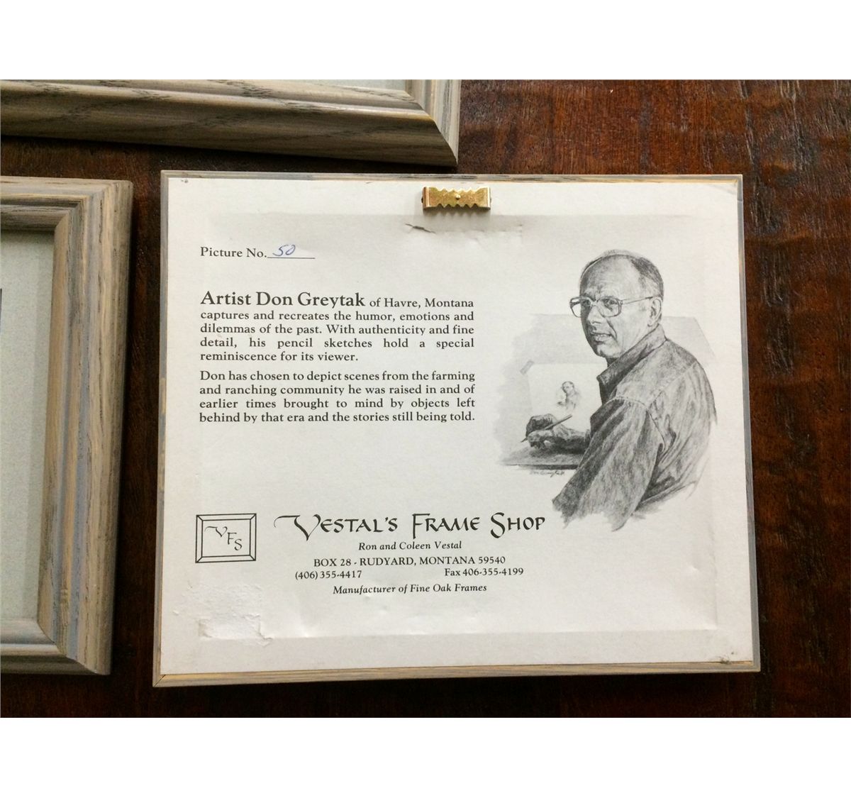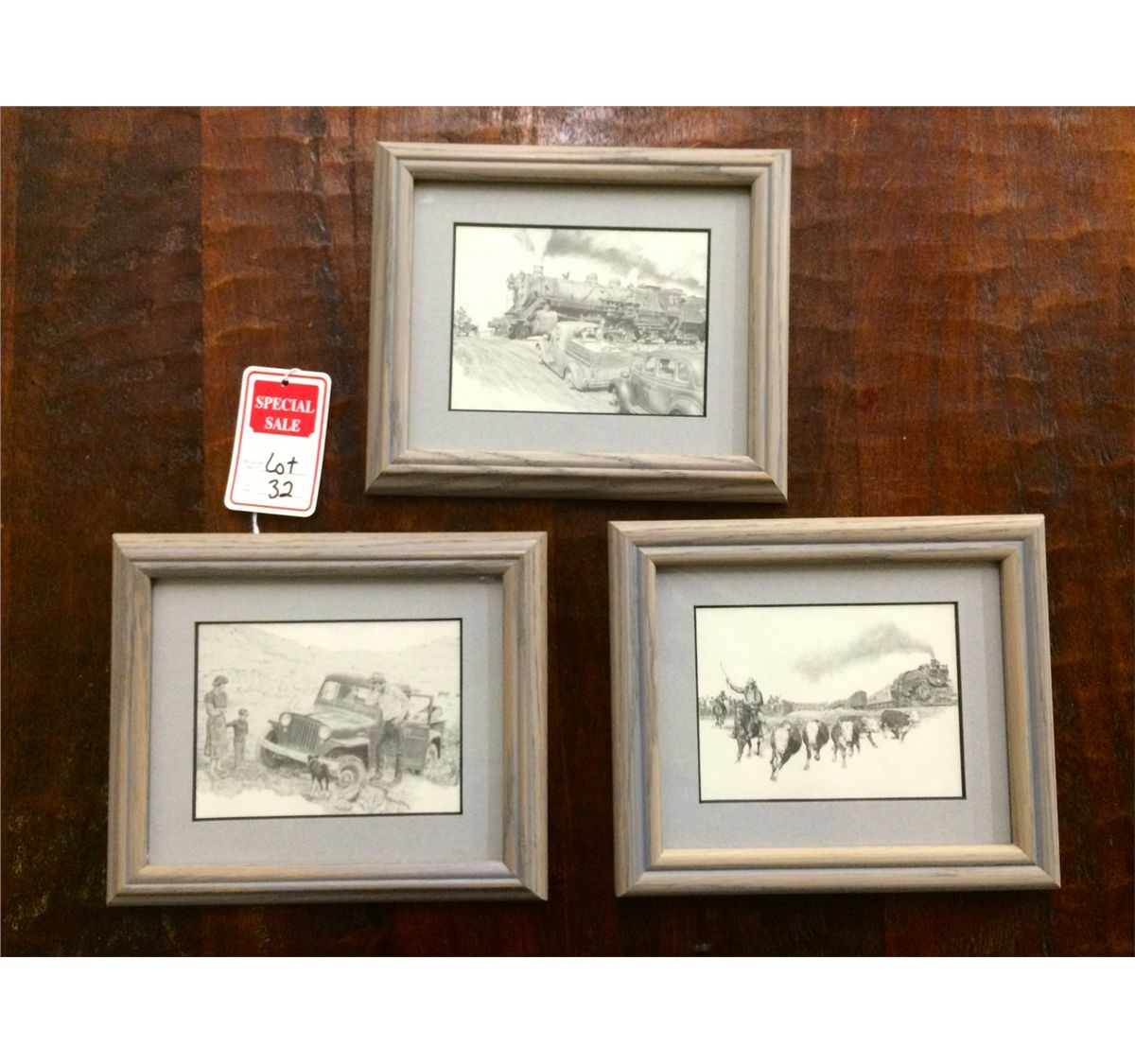 According to the write-up on the back, the artist is from Havre, Montana and captures the humor in emotions and dilemmas from the past. There are three different scenes which all appear to be from the mid 1900s Era. Each measures approximately 8 1/4 inches wide by 7 inches tall.