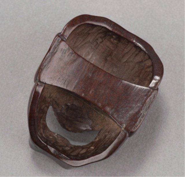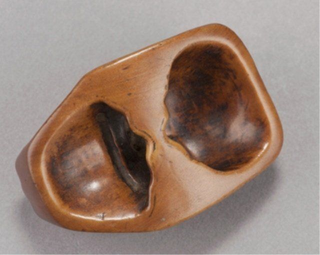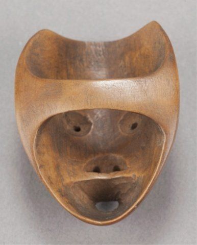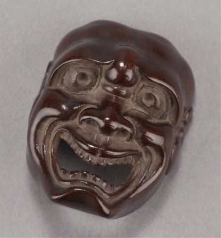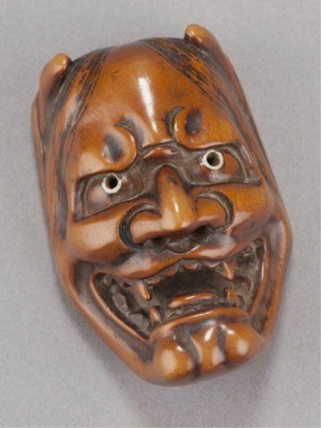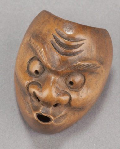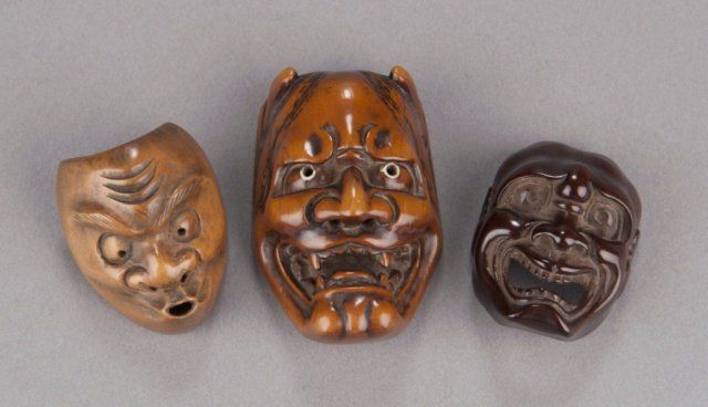 Early 19th century. The first, a kyogen mask of Usofuki, the pupils are cut through to the back, the attachment by a cross-bar on the back. 1 1/2in (3.8cm). The second, a Noh mask of Hannya, the eyes have been pierced through and are lined with ivory. Some gentle wear commensurate with age and traces of a border design on the back crossbar. 2 1/8in (5.4cm). The third, a Noh mask of Tobide in cherry wood, the mouth open and cut through, good color and patina. 1 1/2in (4cm).