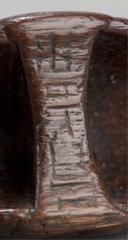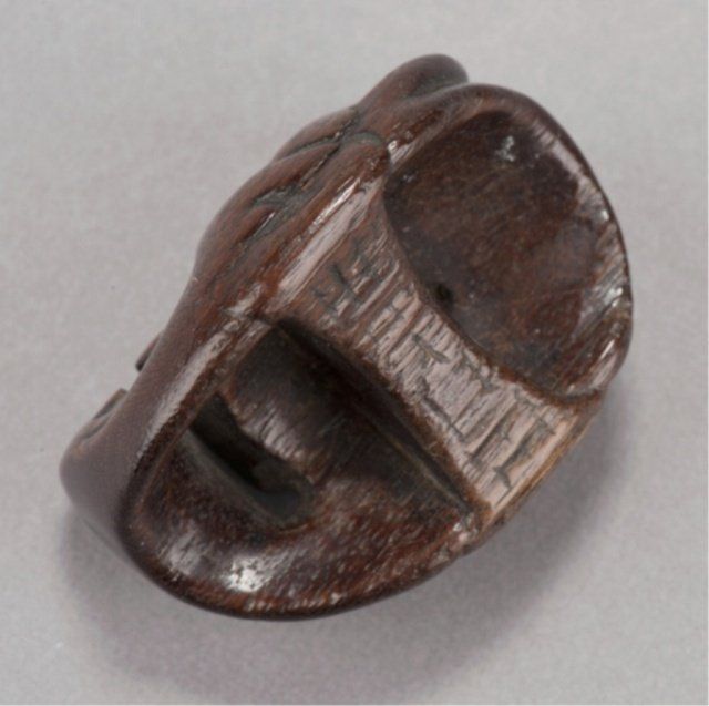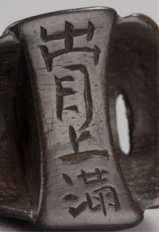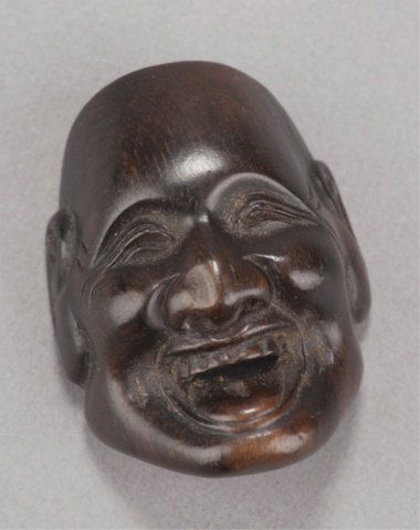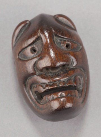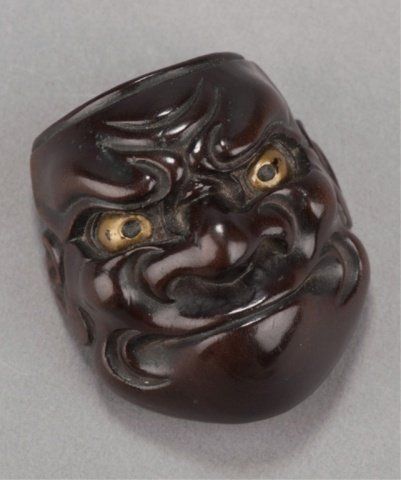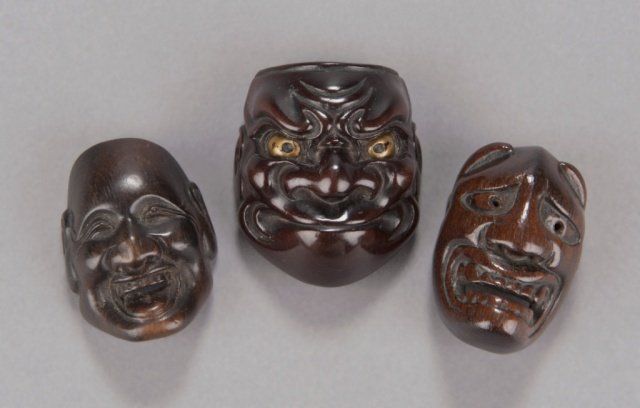 Deme Family, Tokyo, Late 18th century. , Late 18th century. The first, a Beshimi type, with eye in gold lacquer, signed on the crossbar, Deme Uman, and in the upper recess, Ten Ka Ichi. 1?in (4.3cm). The second, mask of Hannya in cherry wood, signed on the crossbar, Deme Joman. 1?in (4.2cm). The third, mask of a smiling man, signed on the crossbar, Deme Joman. 1?in (4cm).