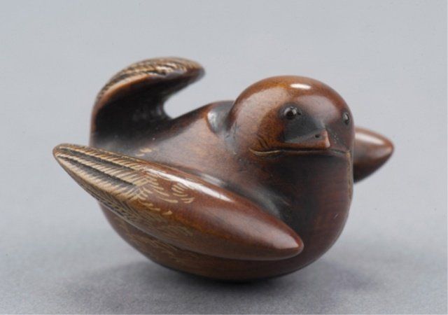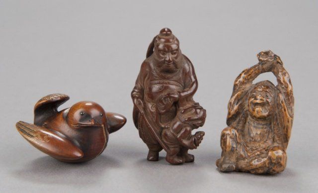 Mid 19th century. The first, by Shuko Hidemitsu, a sparrow with upswept tail and gold lacquer featherwork. Signed on the underside of the tail, Hidemitsu. 1in (2.4cm). The second, Shoki has captured an Oni and has attached a rope and halter to him. Signed on the underside, Shunmei or Haruaki. 2in (5.1cm). The third, Daruma yawning with arms over head. Signed on the underside, Gyokuzan. 1 3/4in (4.4cm).