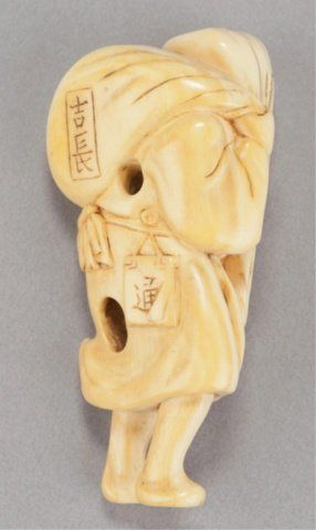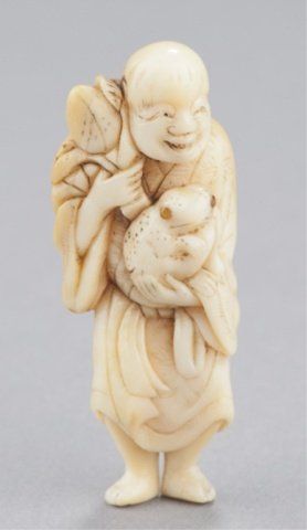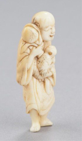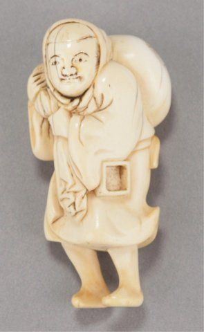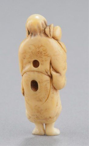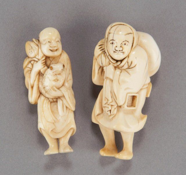 By Yoshinaga and Yoshinaga School, Kyoto, , 2nd half 18th century. The first, by Yoshinaga, a rice peddler standing with his sack of rice flung over his shoulder, a square rice measure is suspended from the front of his sash while from the back and attached to a manju, is a kinchaku bearing the single character, Kayoi. Signed on the sack in a rectangular reserve, Yoshinaga. 2? (6.5cm). The second, Gama Sennin standing and cradling a large toad in his left hand while his right holds a large peach to his shoulder. The eyes of the toad are inlaid with horn or amber. Unsigned. (2? 7.1cm).