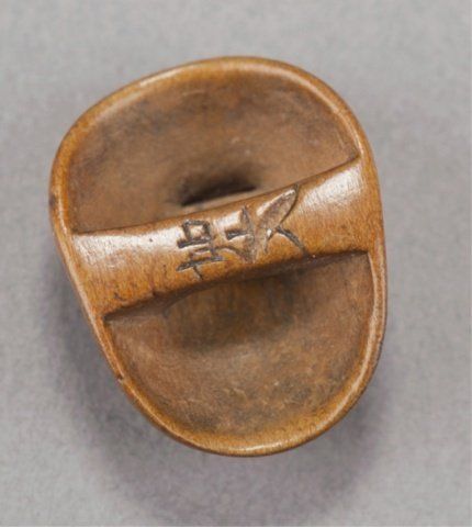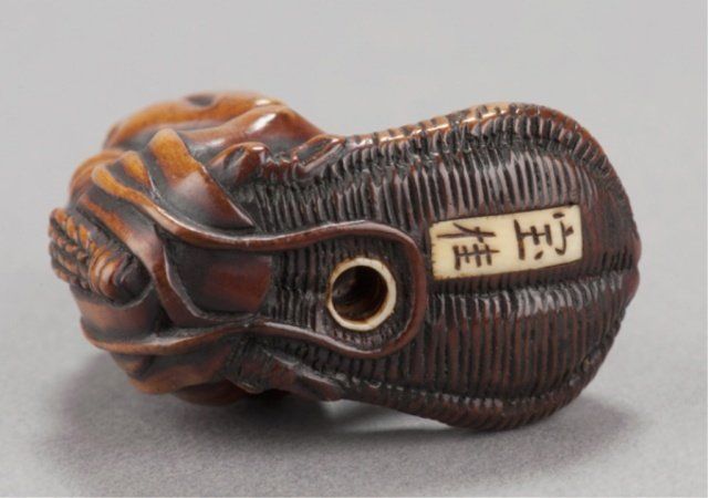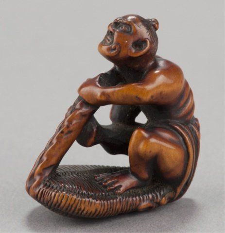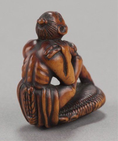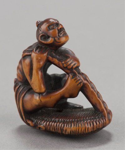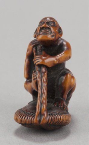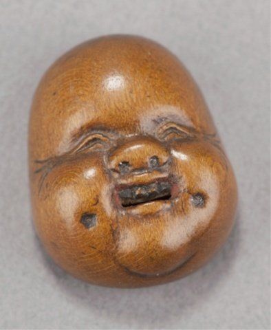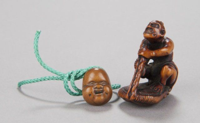 Tokyo, Late 18th century. , Late 18th century. The first, by Jobun, a child's netsuke, Mask of Ofuku, signed on the cross bar without reserve, Jobun. 6/8in (1.9cm). The second, by Hokei, Ni-o seated on a huge straw sandal which he is repairing, one himotoshi lined with ivory, signed on an inlaid ivory tablet, Hokei.1?in (4.1cm). Provenance: The first, Purchased from Raymond Bushell 1957. The second, Barry Davies, London.