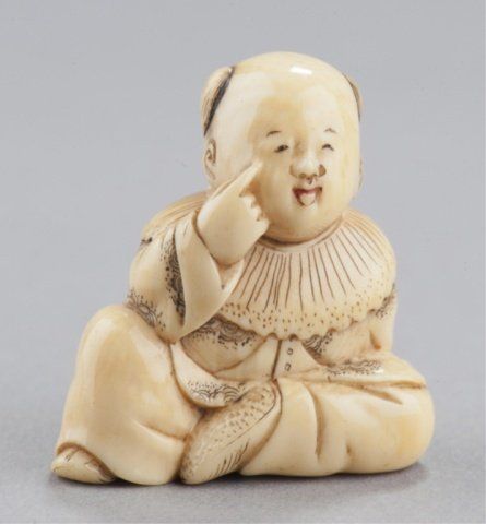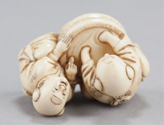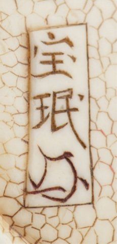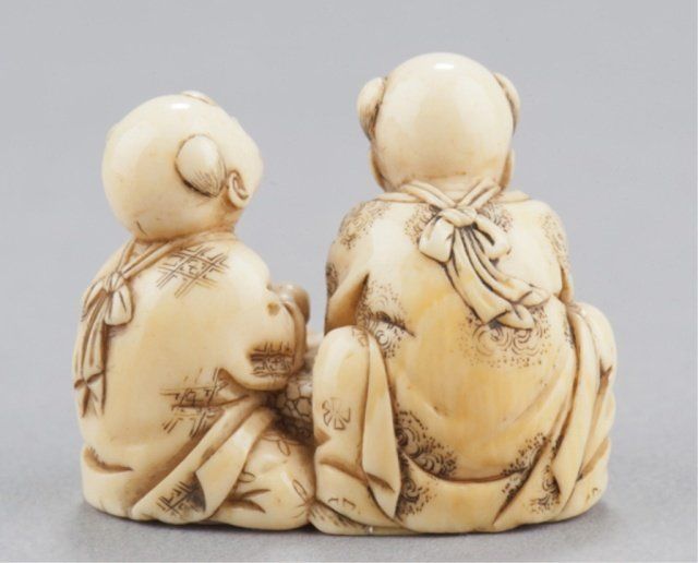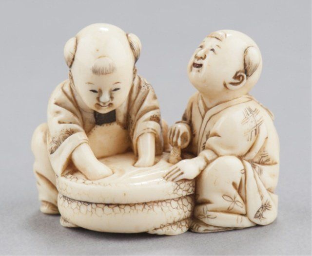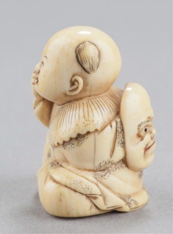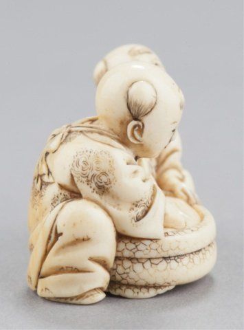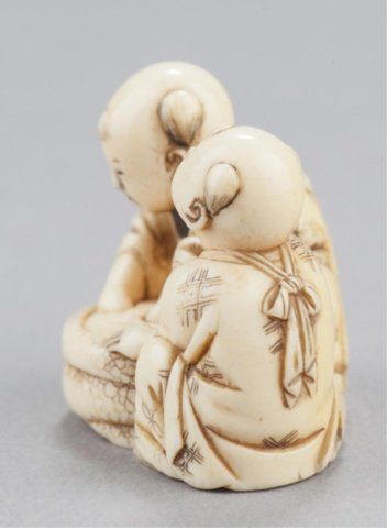 Inscribed Homin. This is(?) the artist described on pages 188-189 of the MCI where FM says "Tokyo. Worked 1850-80. About a dozen netsuke recorded by this carver. Tokyo, Mid 19th century. , Mid 19th century. The first, Seated doing bekkako while a large Beshimi mask is attached to his back. The mouths of the karako and the mask are reinforced with red. Inscribed on the underside. 1?in (3.5cm). The second, two karako engaged in catching goldfish from a bowl. Inscribed on the underside. 1?in (3.3cm). Provenance: The first, Purchased in Tokyo, 1951. The second, Purchased from R. Koscherak, 1951.