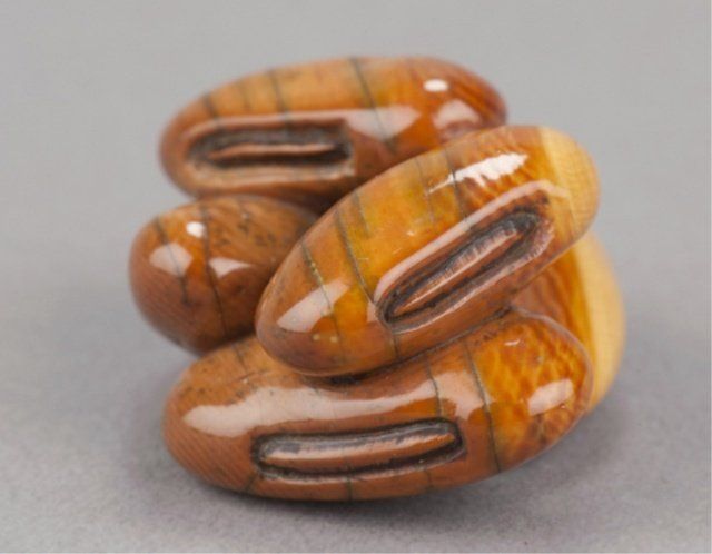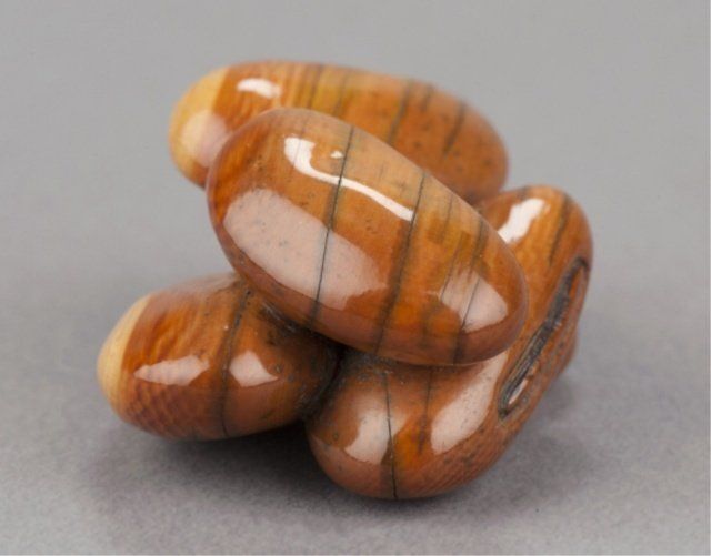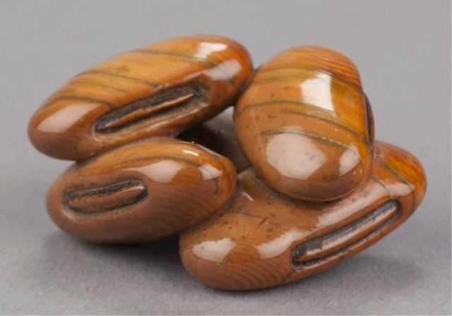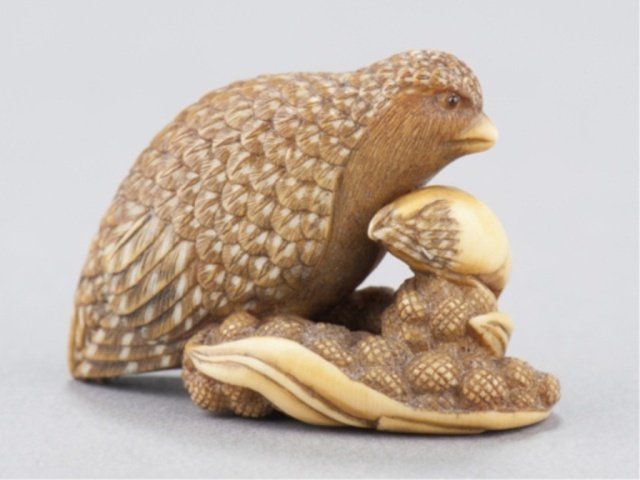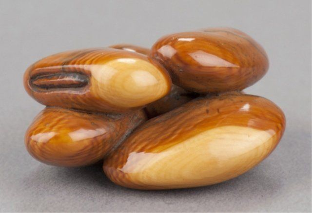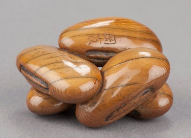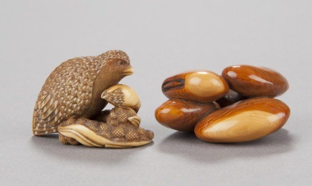 School of Okatomo, Kyoto, , Late 18th/early 19th century. The first, a cluster of five lima beans beginning to open, inscribed, Okatomo. The second, a quail and her young feeding on a millet plant, the eyes of both inlaid with dark horn, inscribed on the underside, Okatomo. 1 5/8in (4.1cm).