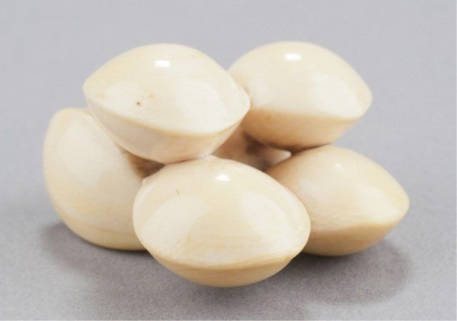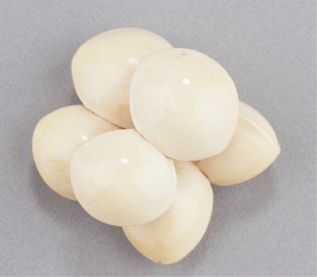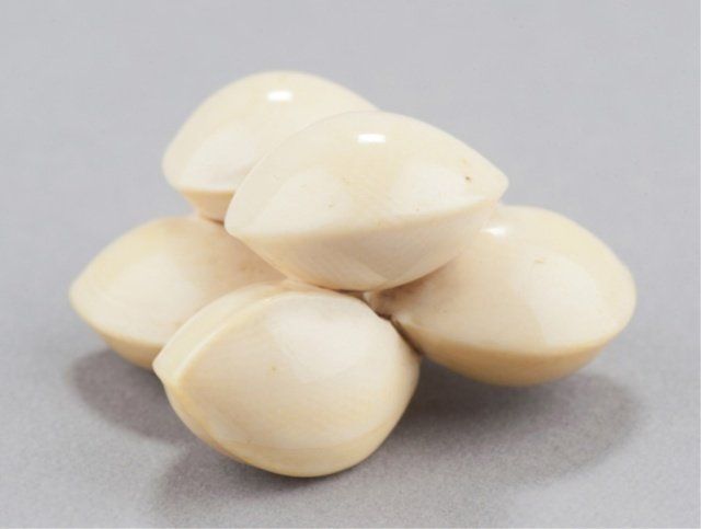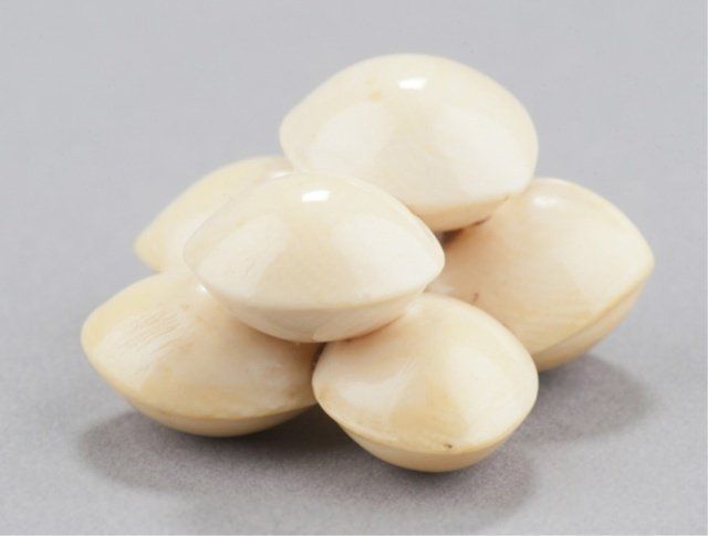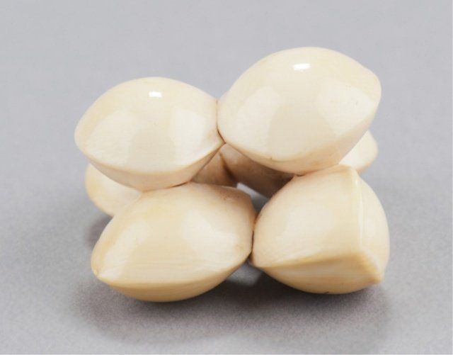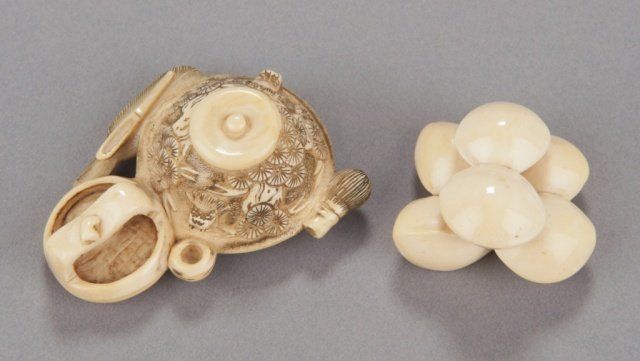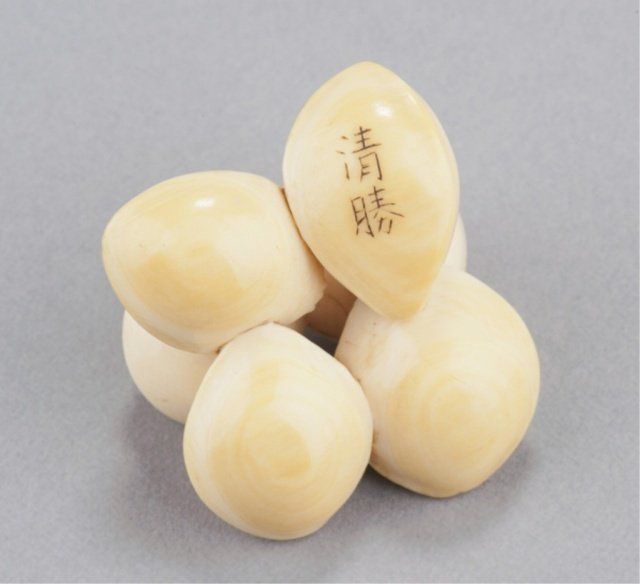By Kiyokatsu & attributed to, Kyoto, , Mid 19th century. The first, a group of six ginko nuts, signed Kiyokatsu. A similare piece that appears to be in the same hand in the British Museum(Barker & Smith, Page 56, Fig.72), also unsigned and attributed to Kiyokatsu. 1?in (3.9cm). The second, tea ceremony implements, unsigned. 2?in (6.3cm). Provenance: The first, Sotheby's, London, February 24, 1971; Lot 77. The second, Ex Scott Meredith collection.