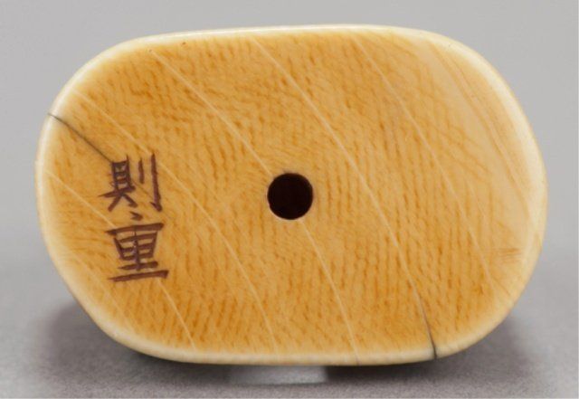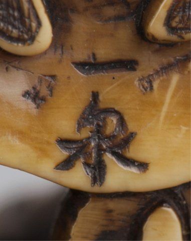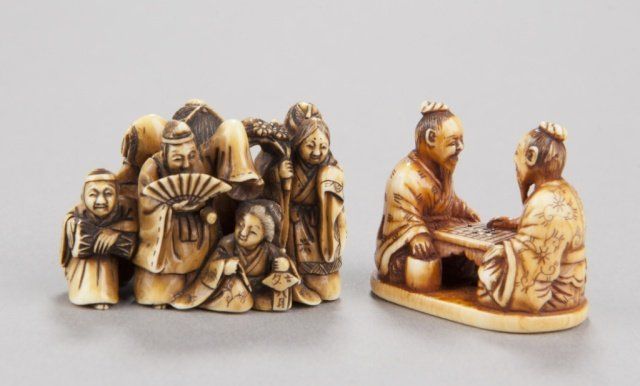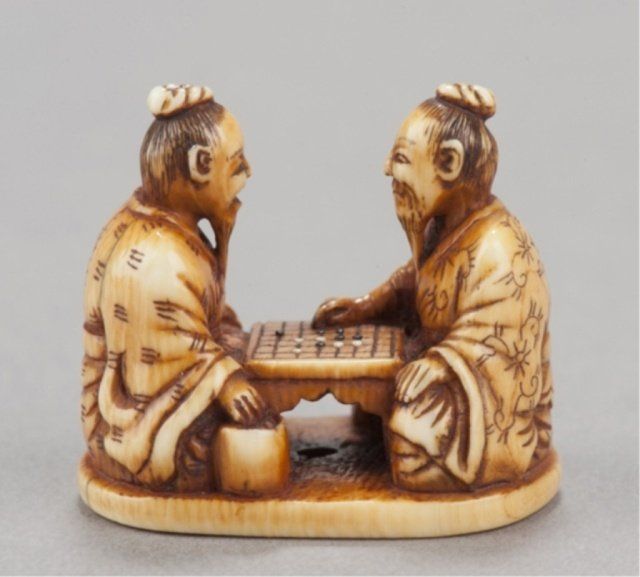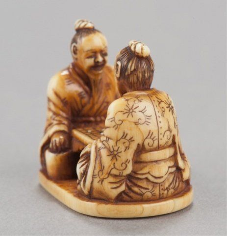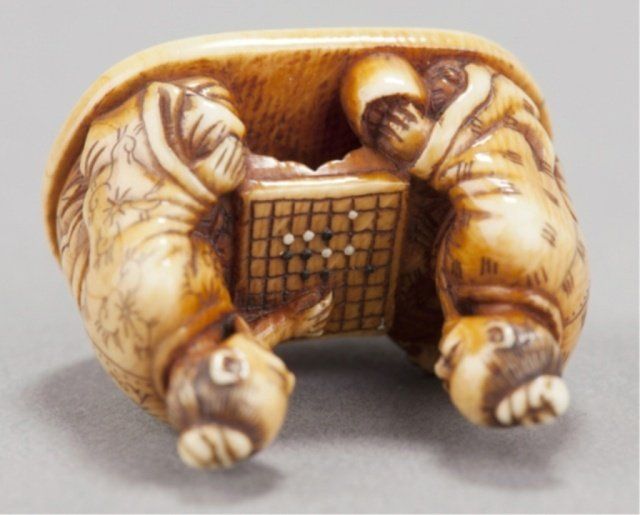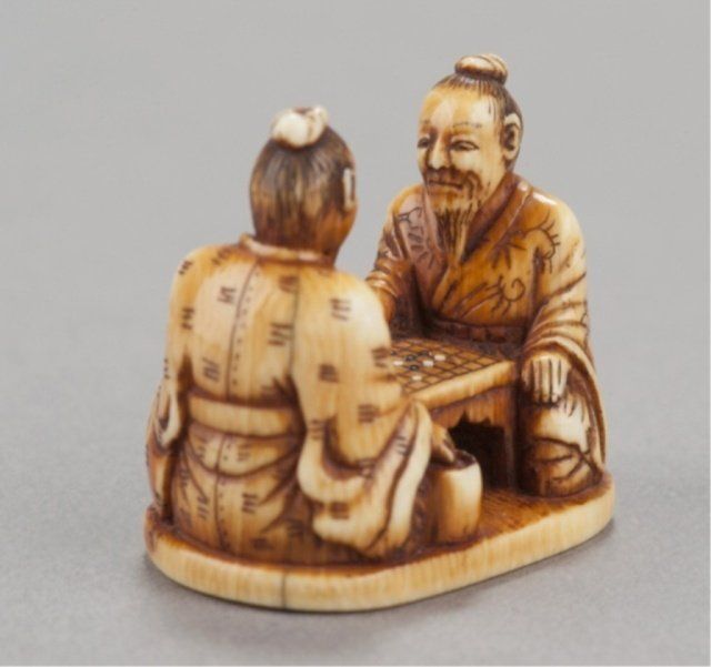 Tokyo, Mid 19th century. , Mid 19th century. The first, by Issen, Tokyo, 3rd quarter 19th century. Shoki surrounded by five court figures and holding onto an oni appearing as a dog. Signed on base, Issen. 2.16cm (1 1/8"). The second, by Norishige, Tokyo. Two elderly gentlemen playing a game of go. Signed on the underside, Norishige. 3.1cm (1 7/32"). Issen appears to be the mid 19th century Issen Davey No857. 7/8in (2.2cm). Provenance: Purchased from R. Koscherak, 1951.