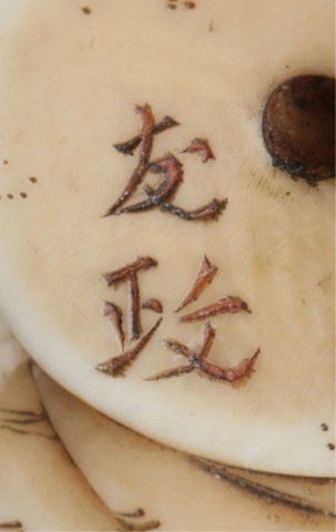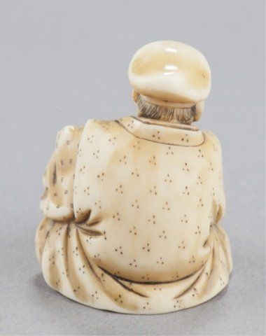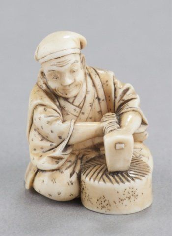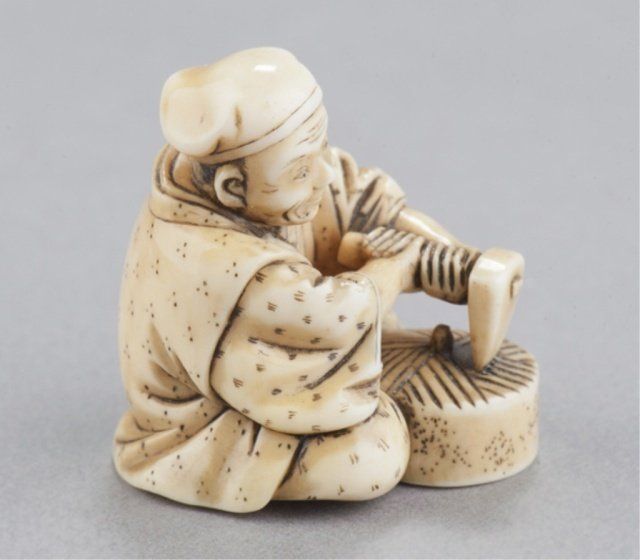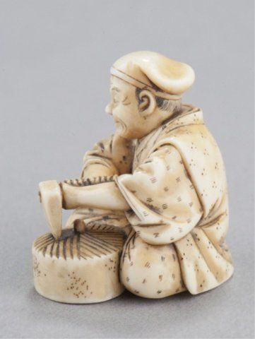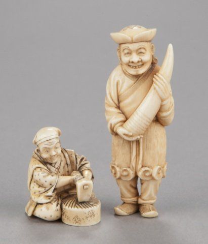 Tokyo, Late 19th century. , Late 19th century. The first, attributed to Tomomasa, 2nd, a Stonecutter making a millstone. Signed on the bottom without reserve, Tomomasa, the characters filled with red ink. 2?in (7cm). The second, attributed to Tomomasa, a Dutch merchant standing holding an ivory tusk. Signed on the back in an oval reserve, Tomomasa, just beneath the himotoshi. 1?in (3.3cm).