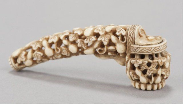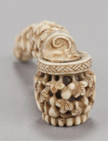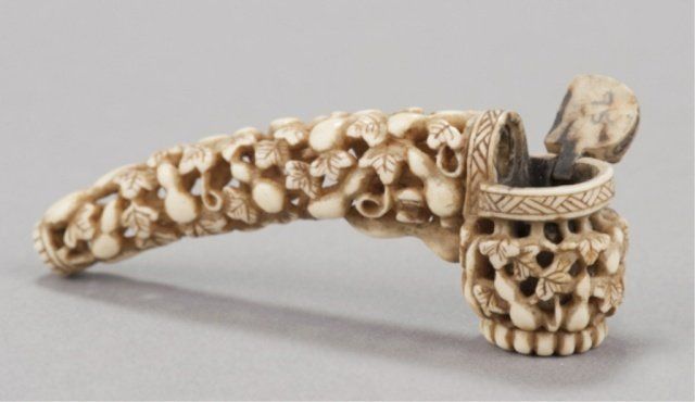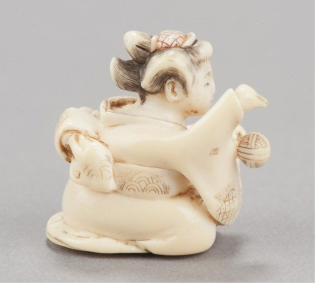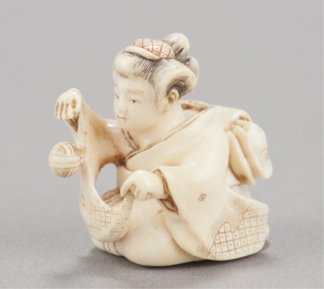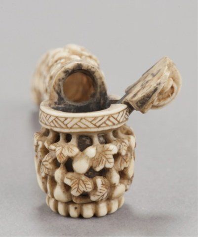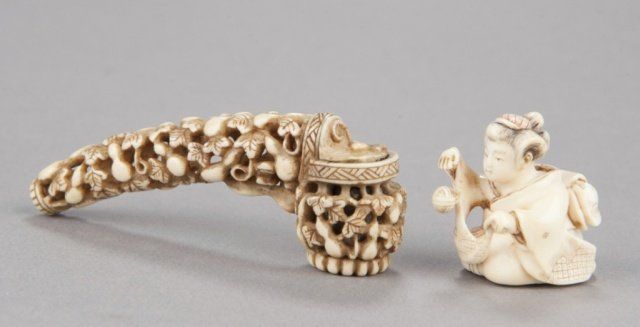 Mid 19th century. The first, a miniature ivory yatate, completely reticulated with ryusa style carving of gourds and vines, the cap for the ink-well is hinged. 3 3/8in (8.4cm). The second, a marine ivory of a woman bouncing a ball, she is sitting in a full formal kimono, the ball in mid-air, both with diaper patterns, her hair reinforced with sumi ink, her hair ornament with red ink, himotoshi liner stained green. 1 1/4in (3.2cm).