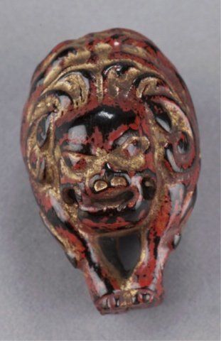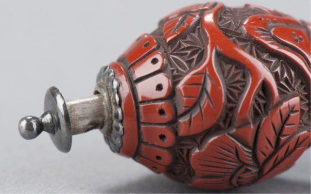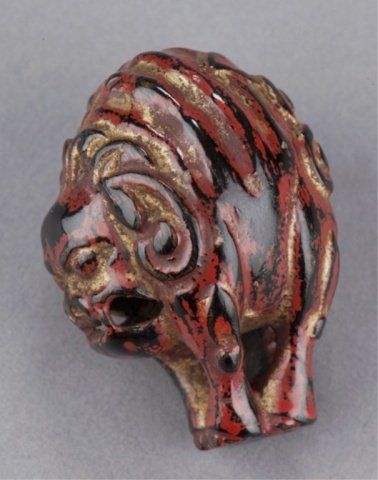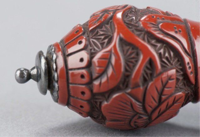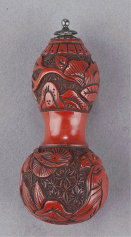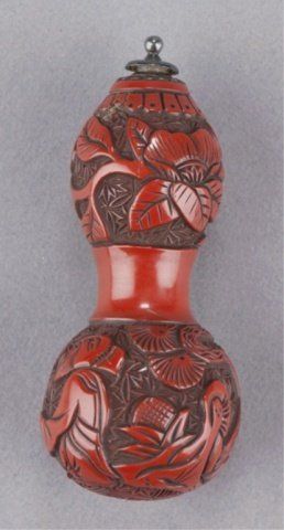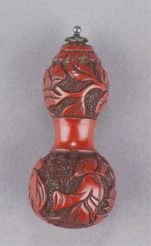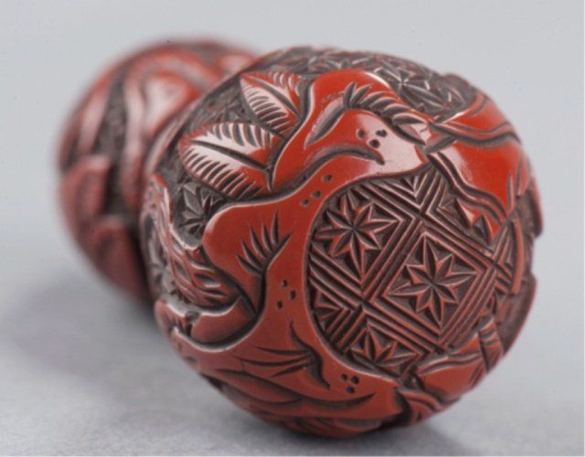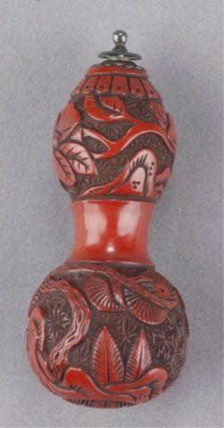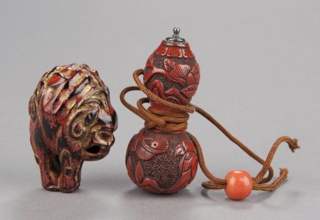 The first, a negoro lacquer standing Shishi, black & red with gold highlights.. 1 3/4in (4.3cm). The second, a tsuishi gourd showing two Chinese in a garden setting, with removable silver stopper. 2 1/4in (5.7cm).