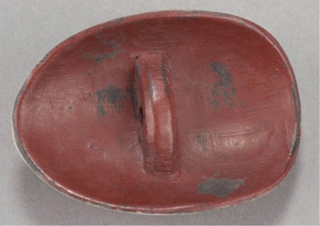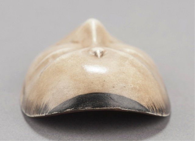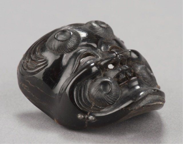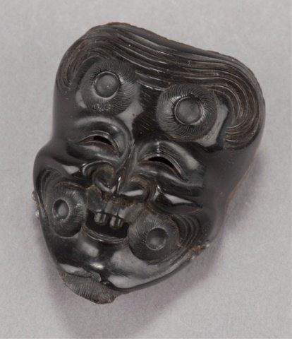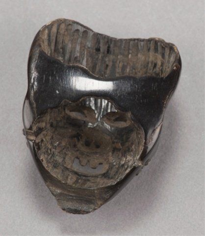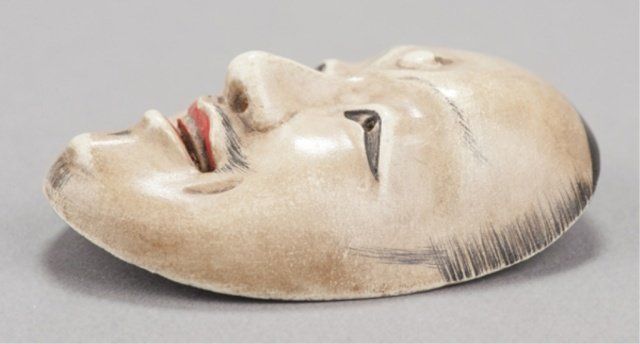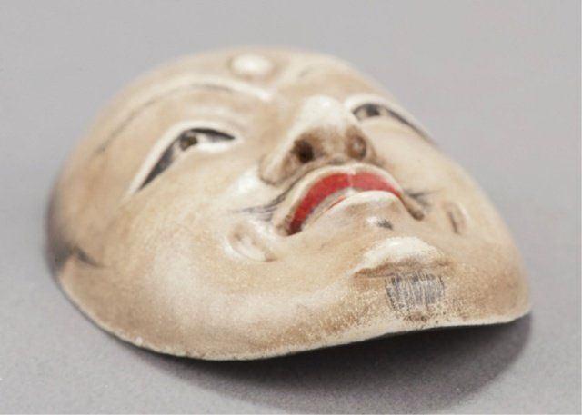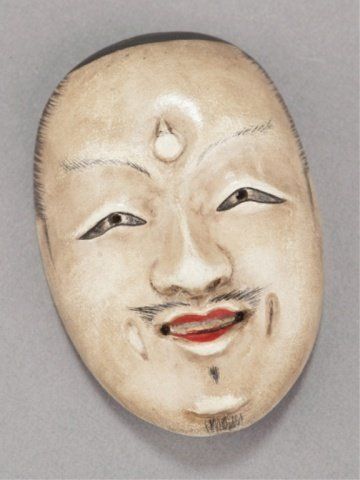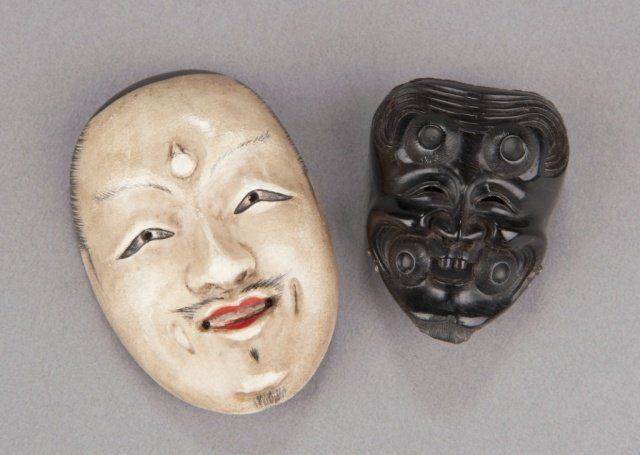 Mid 19th century. The first, a painted wood Bugaku mask of Chujo in wood painted in black, white and red, with a tama-shaped urna on the forehead, loop attachment at the back. 2 3/8in (6cm). The second,buffalo horn Sambaso Mask of Kokushiki-Jo with silver details and bar attachment, simulated jaw hinge. 1 3/4in (4.4cm). Provenance: Both, Ex M.T. Hindson collection, Sotheby's, London, October 1, 1967, Lot 350. The first, Illustrated in Davey, Fig. 1272. Ex Guest collection, No. 1961. The second, Illustrated in Davey, Fi., 1286. Ex Guest collection, No. 985. Ex Hart collection.