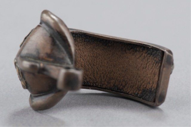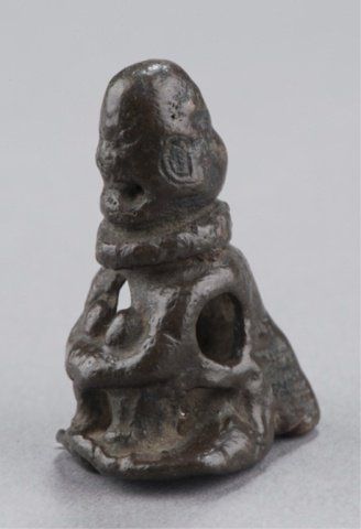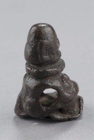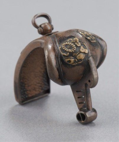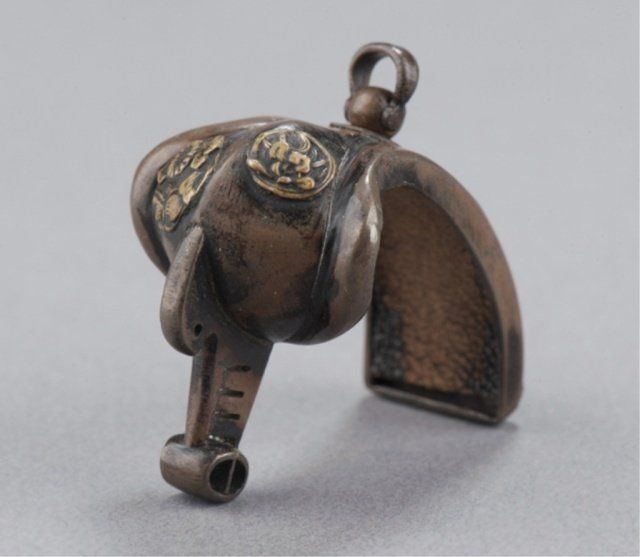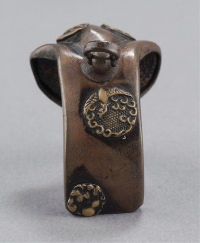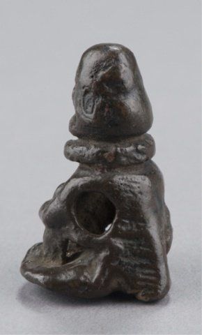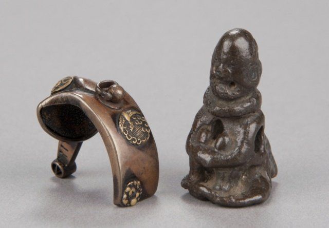 Mid 19th century. The first, a stirrup in copper lined with leather, a design of four different mon applied in sentoku, principle being one of a Ho-o bird among the clouds, attachment by a copper ring. 1 3/8in (3.4cm). The second, early 18th century, a bronze itoin in the typical shape of a monster man, seated with a ruffle around the neck, the handle pierced in several places, the seal on the bottom has traces of red ink. 1 5/8in (4.2cm).