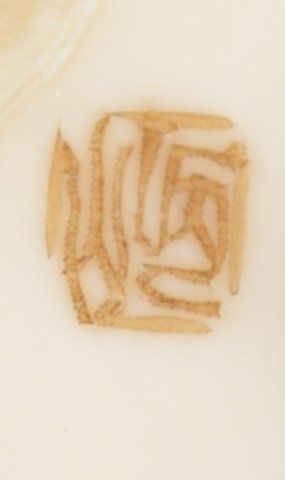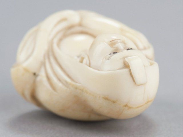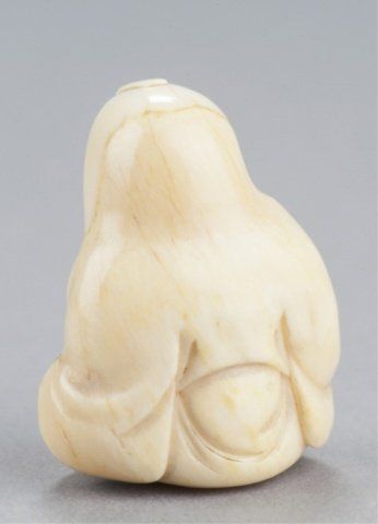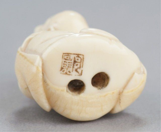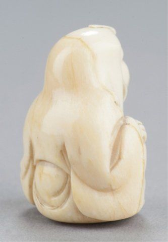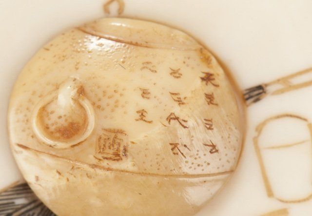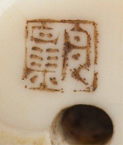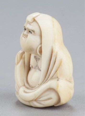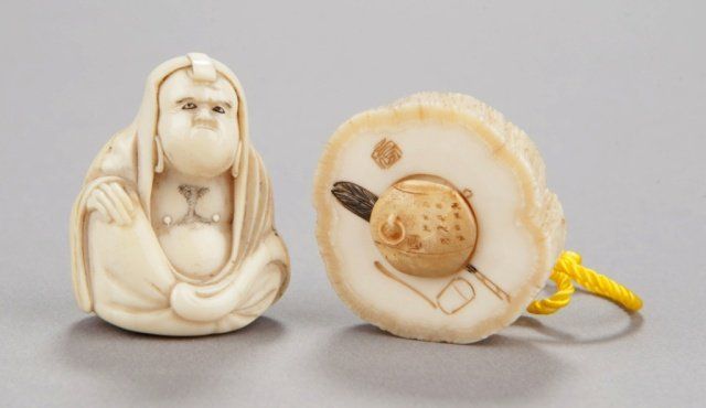 By Kawamoto Shuraku. Tokyo, Mid 19th century. , Mid 19th century. Both signed with an intaglio carved seal, filled with sepia. The first, a netsuke of Daruma playing kamifuki. Eyes, eyebrows, and chest hair highlighted with black ink, half of the figure is the outer crust of the tusk that has been carved and polished and is beginning to patina. 1?in (3.9cm). The second, a manju with the crust intact and beautifully polished, the center opening has been fitted with an ivory plug that provides a cord opening on the otherwise unadorned reverse side, and on the obverse is carved in the shape of an iron tea kettle bearing a 10 character inscription and a faux seal and is surrounded by an incised design of a tea whisk, tea caddy and spoon. 1?in (3.6cm). Provenance: The first, Sotheby's, London, April 29, 1968; Lot 283. Illustrated in Lazarnick, page 1011.