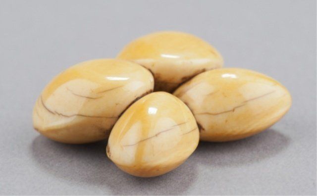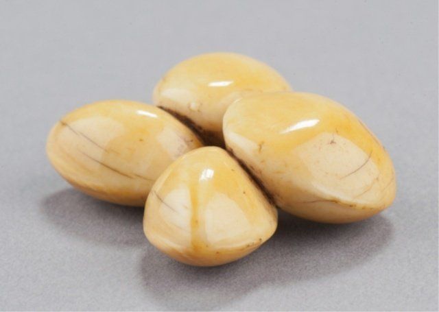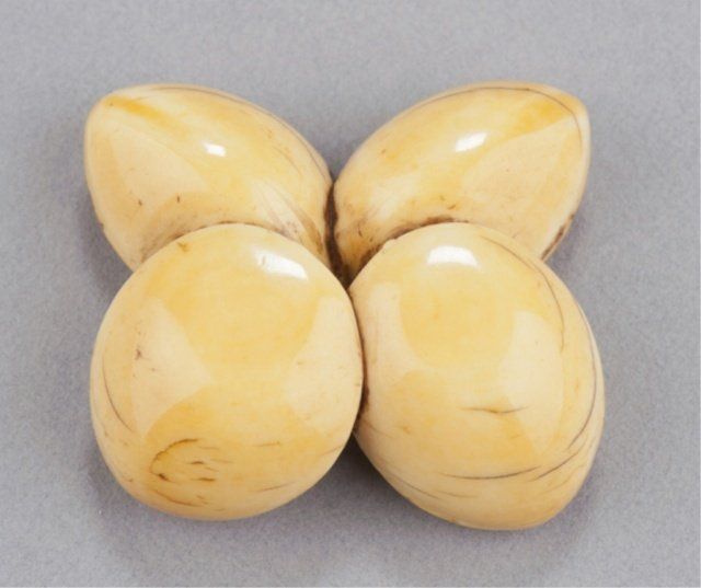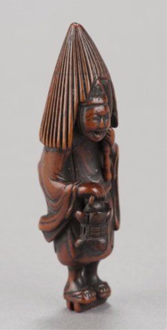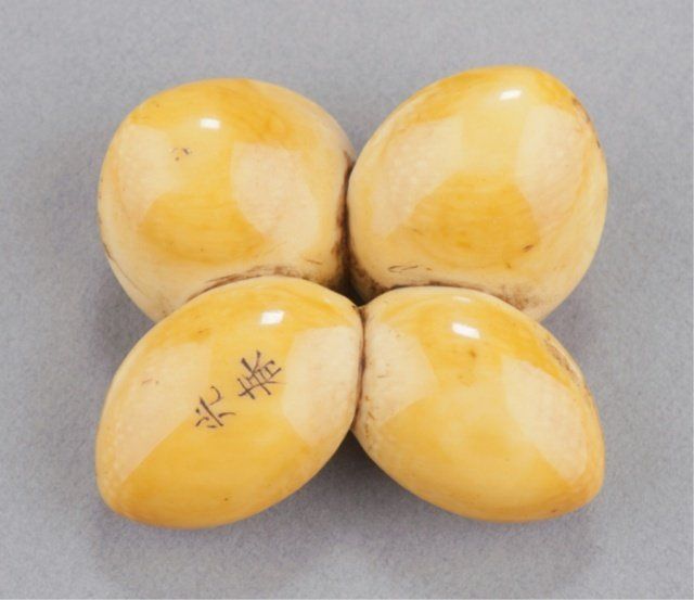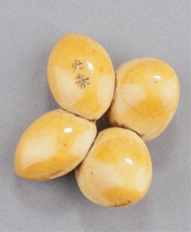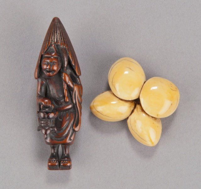 Kyoto, , Late 18th/early 19th century. The first, a carved ivory group of four ginko nuts. Signed on underside without reserve, Mitsuharu. 1?in (3.3cm). The second, wood depicting the story of Tadamori and the suspected thief, as a temple watchman walking on geta holding an oil lantern in his right hand. Signed on the back in oval reserve, Mitsuharu. 2?in (7.3cm). Provenance: The first, Sotheby's, London, November 3, 1969; Lot 281.