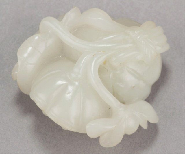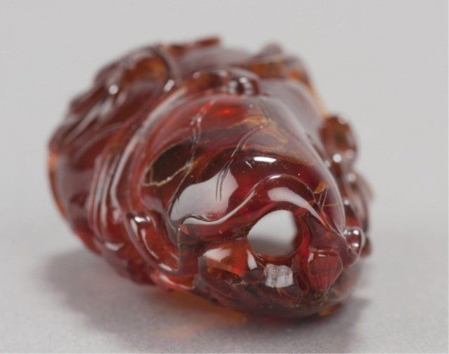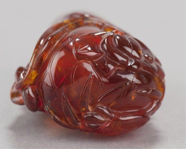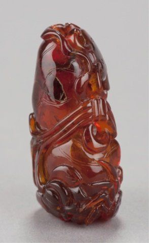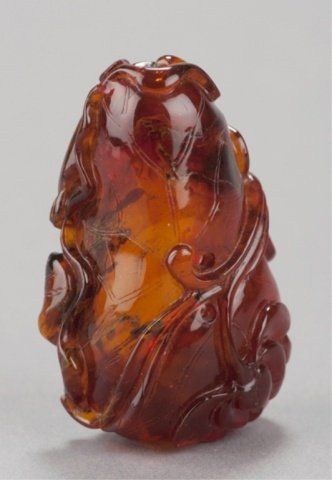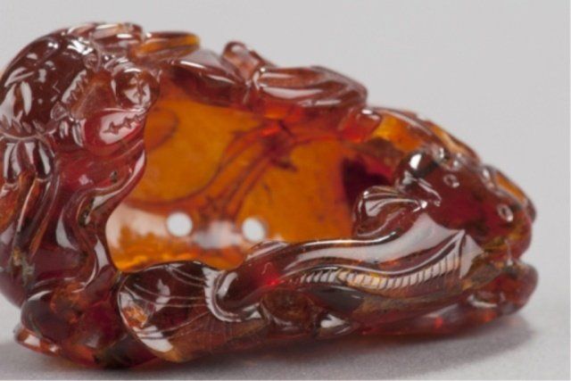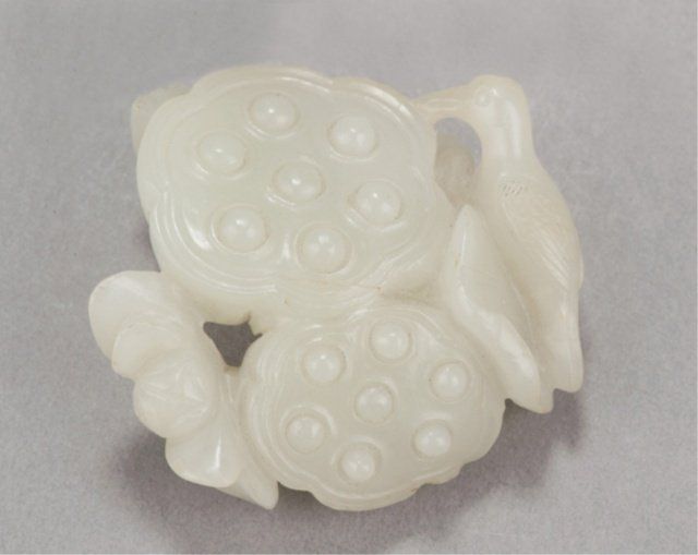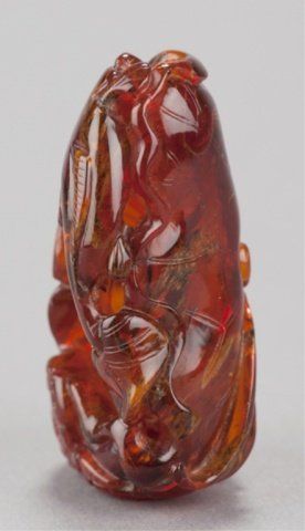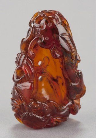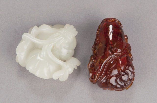Mid 19th century. The first, in jade, a bird and two Lotus pods with leaves in color ranging from white to light green. 2in (5.2cm). The second, in amber, a fish and a crab on a curled Lotus leaf. 2 1/8in (5.5cm). The first, Exhibited: Delgado Museum, New Orleans, LA (March-April, 1960).