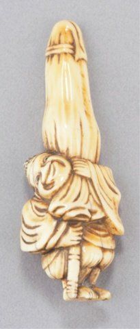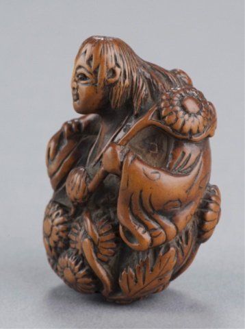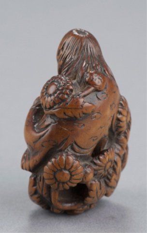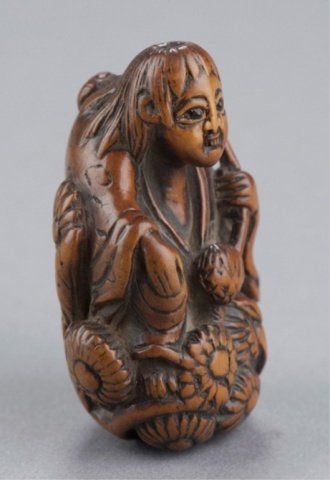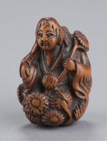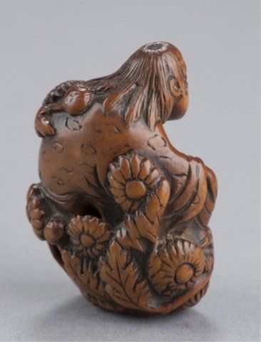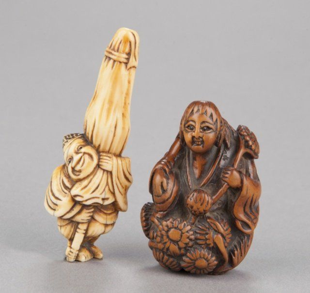 Early 19th century. The first, in ivory, depiction of the story of Ono no Tofu, the 9th Century calligraphist, the anthropomorphic figure of a Frog in court dress holding a folded Umbrella represents the virtue of perseverance. 2 7/8in (7.3cm). The second, in wood, Kikujido, the chrysanthemum boy, sitting with his left hand holding a chrysanthemum stem and blossom, he is also surrounded by a multitude of blossoms, eyes inlaid in black. 2 1/8in (5.4cm). Provenance: The second, Butterfields, San Francisco.