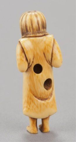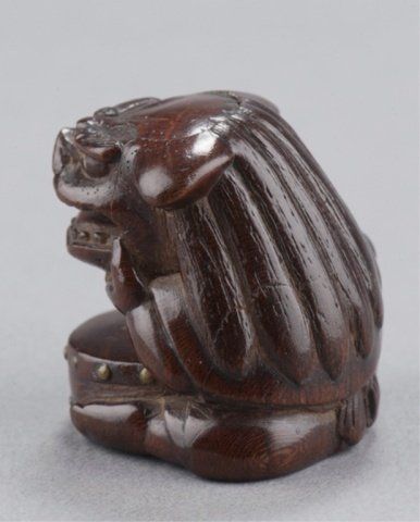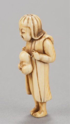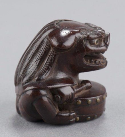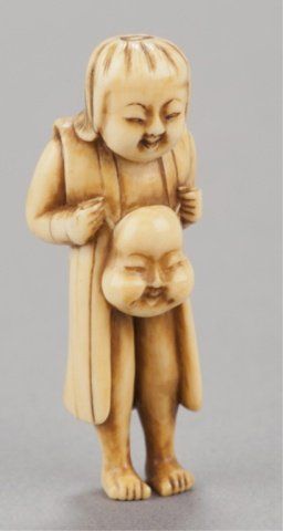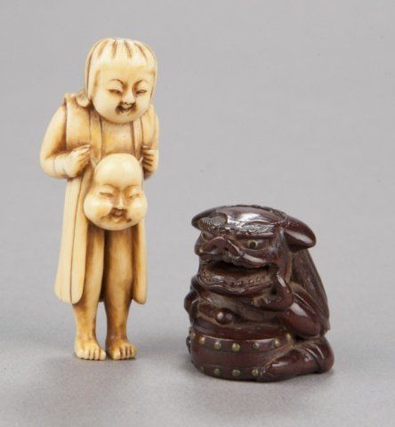 Mid 19th century. The first, an ivory young boy who has just finished his bath, he stands with a fundoshi draped around his shoulders and a slight grin on his face holding a mask of Okame in front of him at waist height. 2 3/8in (6.2cm). The second, possibly cherry, carving of a seated boy wearing a Shishi mask over his head, the eyes of both the boy and the mask are double inlaid in ivory with black centers, a small drum sits in front of him with details inlaid in ivory. 1 1/4in (3.1cm).