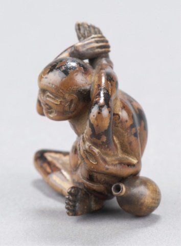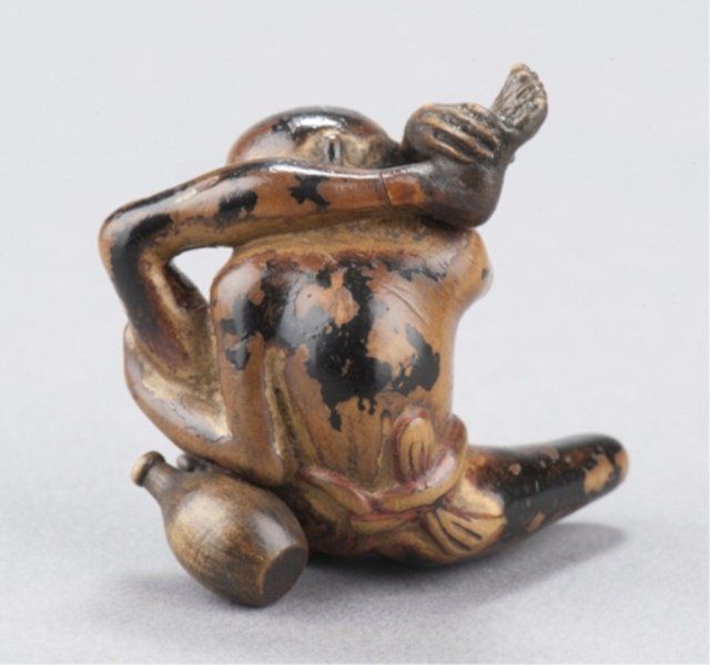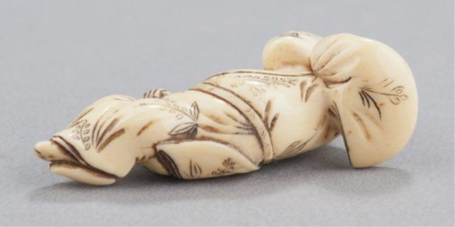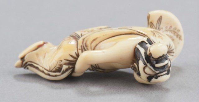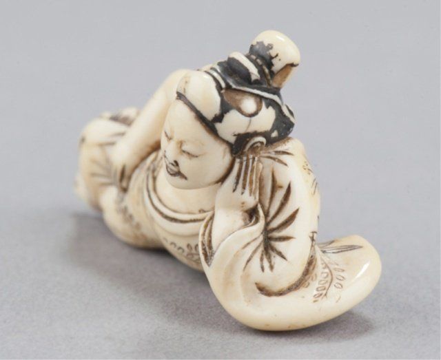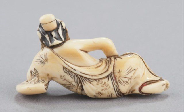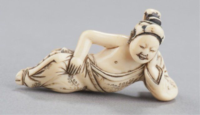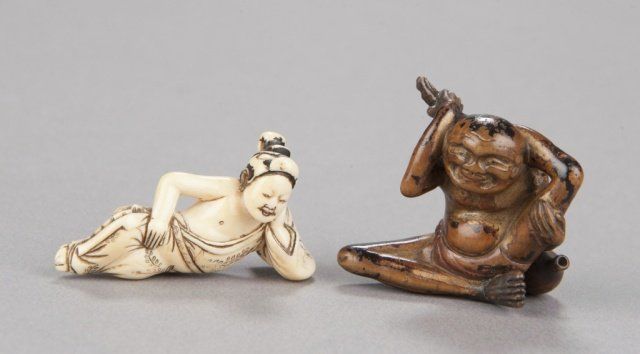 Early 19th century. The first, in ivory, an actor reclining and supporting her head with her left hand, the other holds shut her gracefully draped robe. 1 3/4in (4.6cm). The second, in wood, a contortionist, seated and clad in a loin cloth, the left leg passed over the left shoulder and held with the right hand, he leans against a large sake bottle, the tip of the right foot was broken off and reattached. 1 1/4in (3.3cm). Provenance: The second, Ex C.V.S. Roosevelt collection, Sotheby's, New York, June 2, 1992; Lot 240.