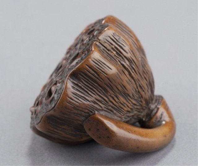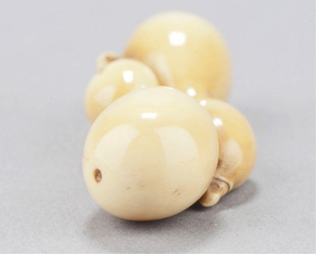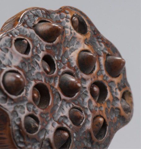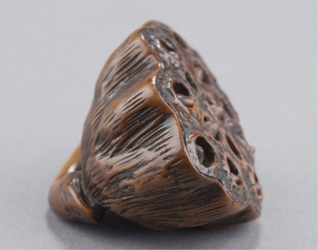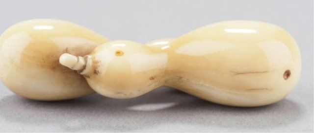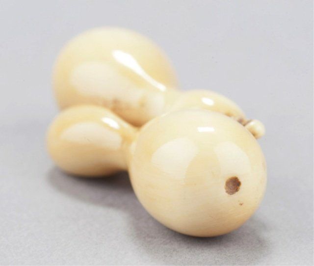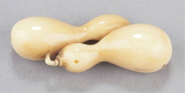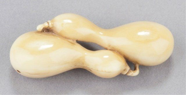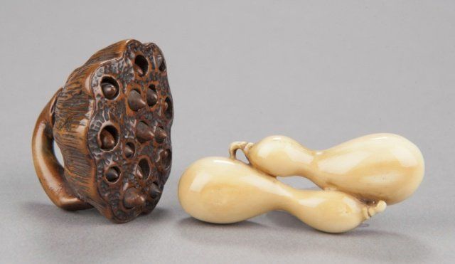 The first, late 18th century, a wood Lotus pod, the thick curled stem provides the himotoshi, the fifteen seeds in the pod are loose, well-carved and naturalistic, considerable wear and patina. 1 3/8in (3.6cm). The second, mid 19th century, an ivory group of two nested gourds, himotoshi use a natural opening, ivory of good color. 2 3/8in (6cm).
