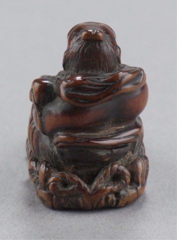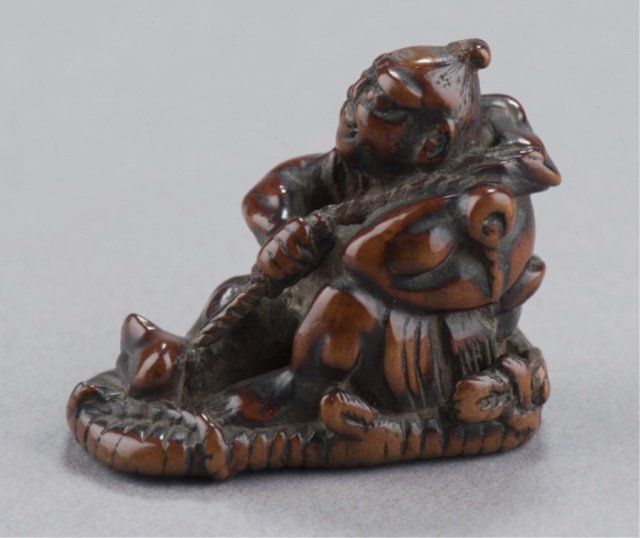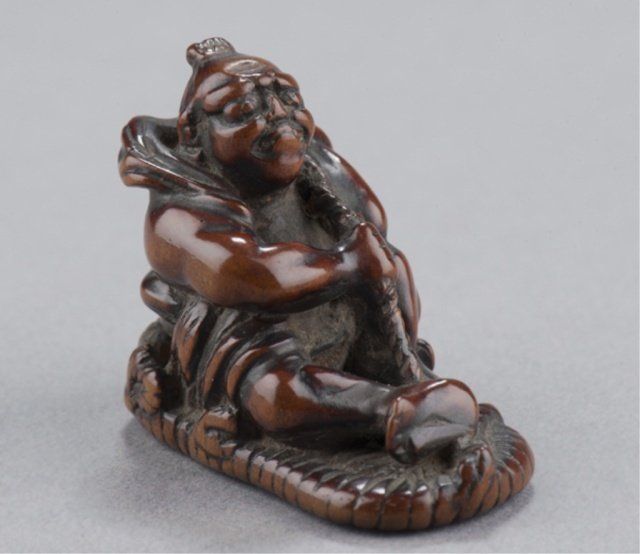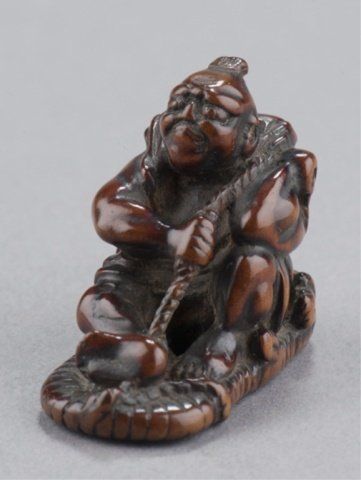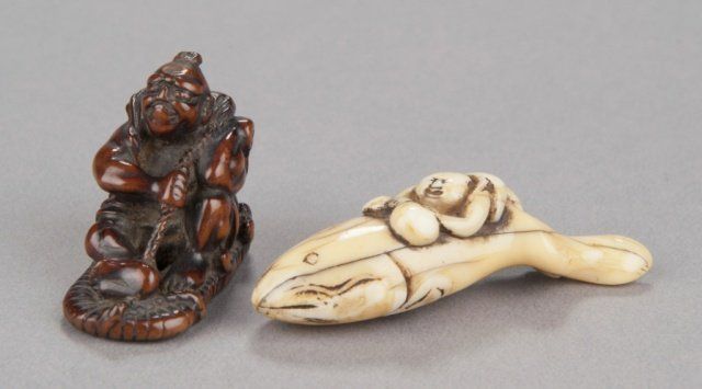 The first, mid 19th century, wood model of a Nio mending a Sandal, with a deep patina, 1 1/4in (3.1cm). The second, 18/19th century, a marine ivory figure of Kadori Miojin holding his gourd with both hands and struggling to mount the Namazu (Earthquake Fish). 2 3/8in (6.1cm).
