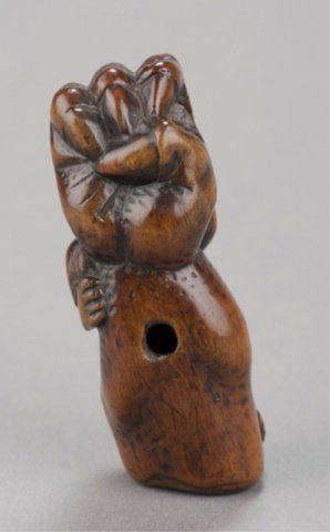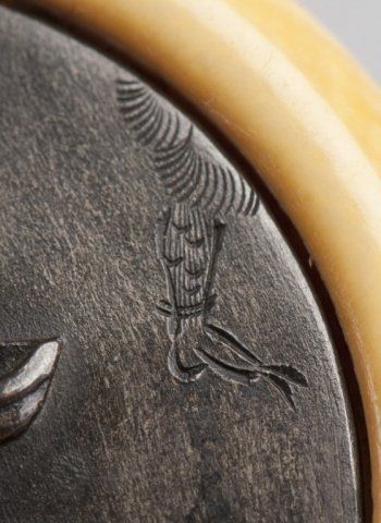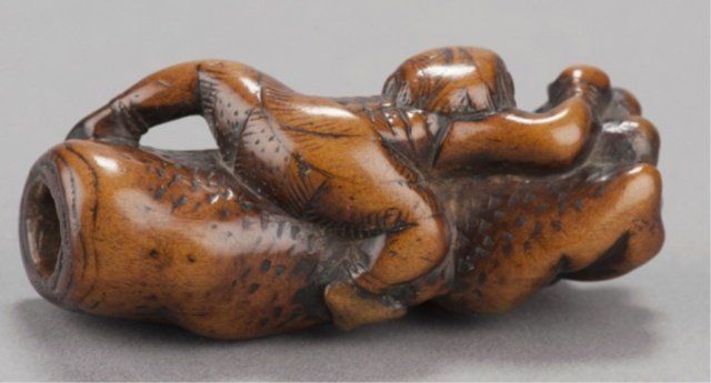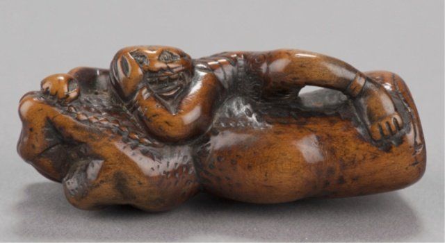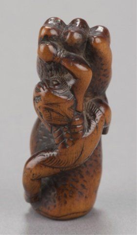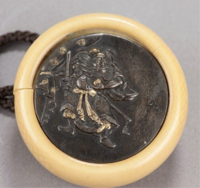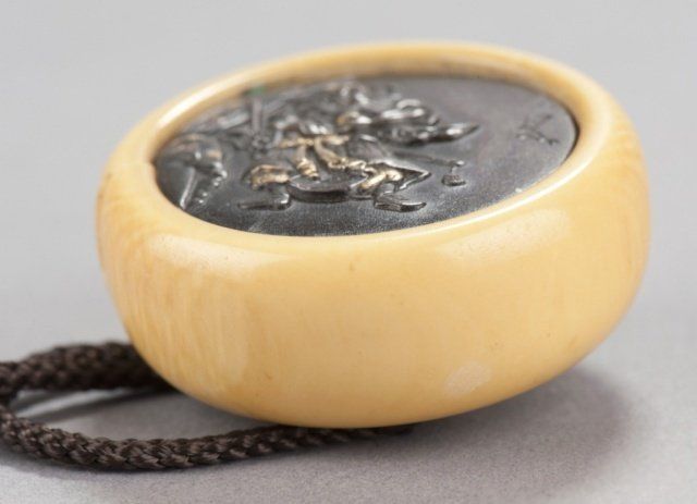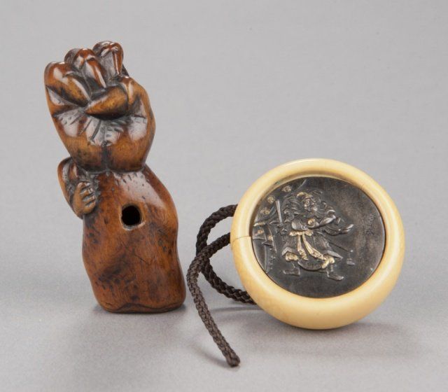 The first, mid 18th century, a wood carving of Oni crouching over the arm of the Rashomon Demon and sobbing uncontrollably, the claws of the demon's hand are clenched in a tight fist, the wood is rather worn and bears a good patina. 2 5/8in (6.7cm). The second, mid 19th century, an good ivory kagamibuta of a Shoki and Oni, the shibuichi disc shows a ferocious Shoki holding a tama in his left hand and wielding his great sword with his right, highlights are in gold, the simple ivory bowl is cracked. 1 5/8in (4.2cm).