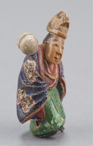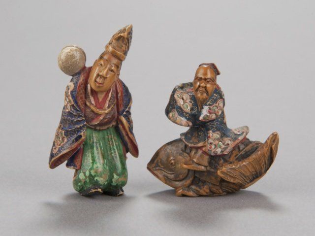 By Nagamachi Shuzan, Osaka, , Early/Mid 19th century. The first, a nobleman playing football. Signed on the right rear in oval reserve, Shuzan. the characters reinforced with red paint. 2in (5.2cm). The second, Kinko riding a giant carp. Signed under the tail on a raised rectangular tablet, the characters reinforced with red paint, Shuzan. 1?in (4cm). Provenance: The first, purchased from Joseph U. Seo, 1966.