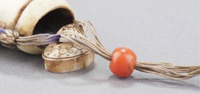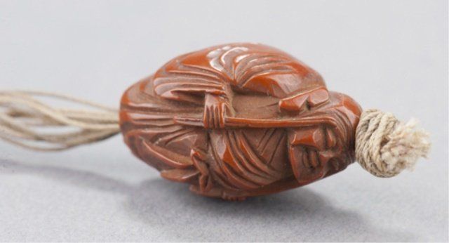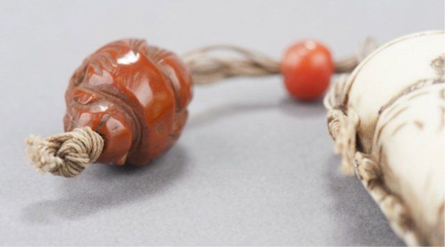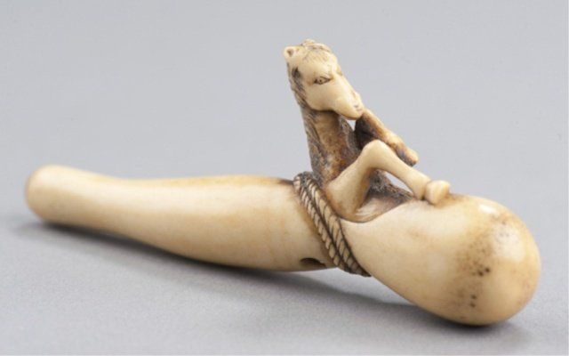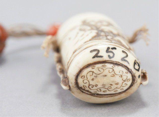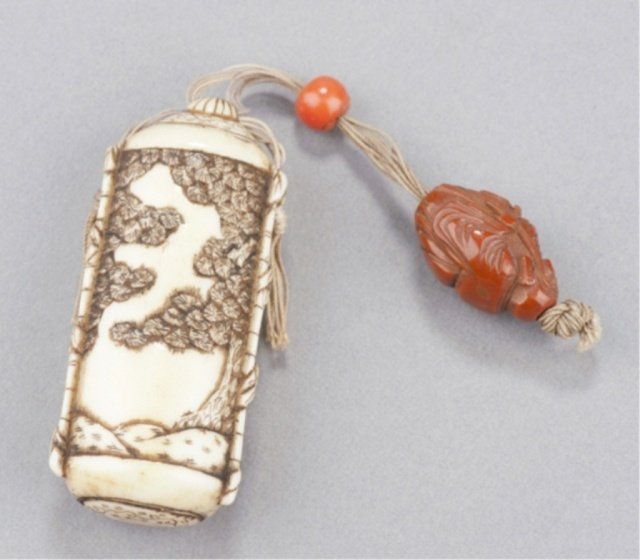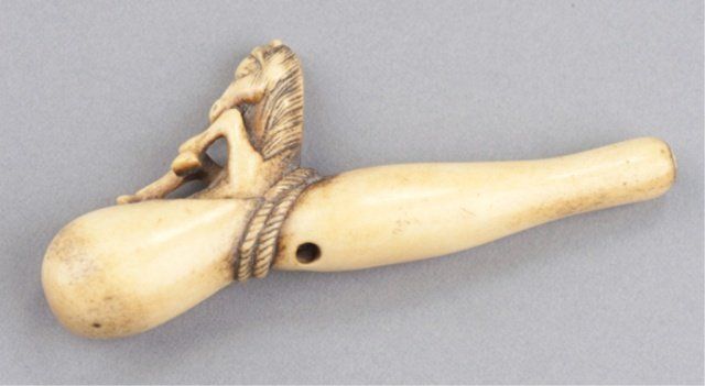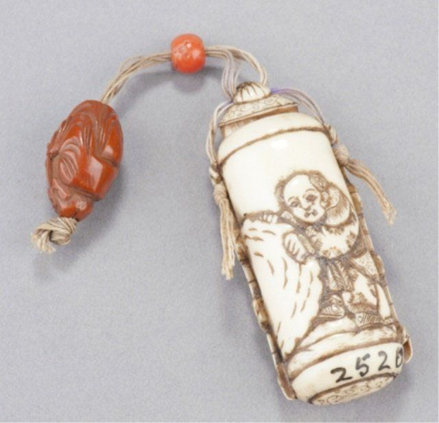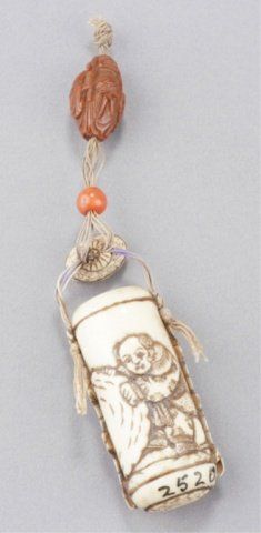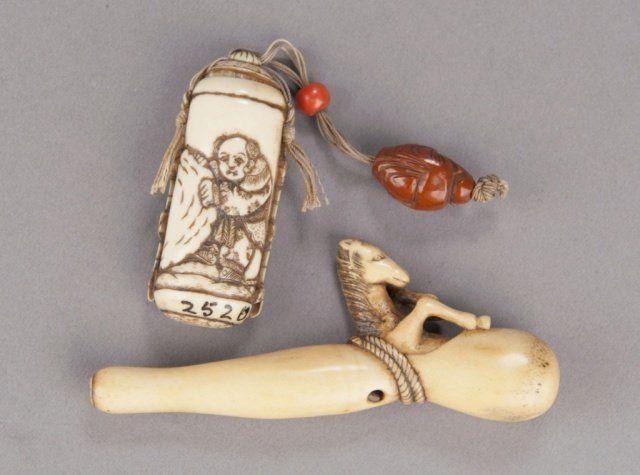 Early 19th century. The first, Chokwaro's Horse emerging from a Gourd, the horse being a branch of the antler, plugged at the open end, moderately worn with a nice patina. 4in (10.2cm). The second, design of a narrow one-case inro, on one side a Karako rolling a large wheel or snowball, on the other a scene of pine trees, the top and bottom with arabesque designs, at the bottom is painted an old collector's or museum number, '2520'. 2 3/8in (6.2cm).