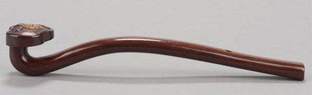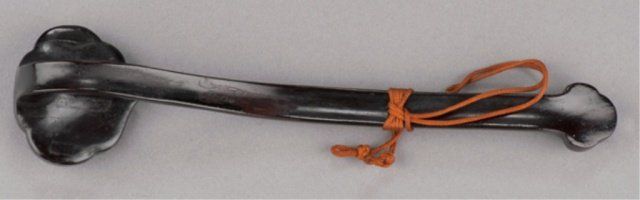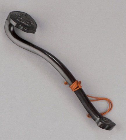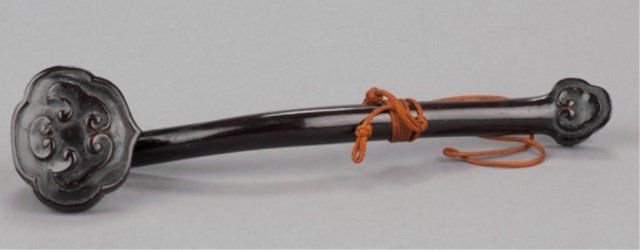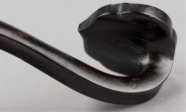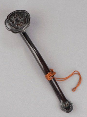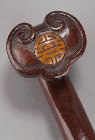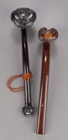 The first, Late 18th century, black wood, both ends have been carved with fungus patterns. 7 3/8in (18.6cm). The second, mid 19th century, in cherry, the typical fungus shape and has been inlaid with a boxwood medallion showing a circular version of the Ju (Long Life) character. 6 3/4in (17.2cm).