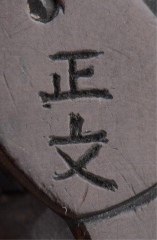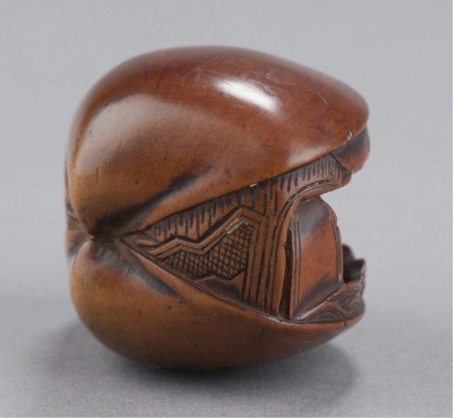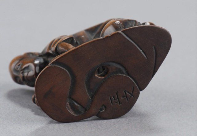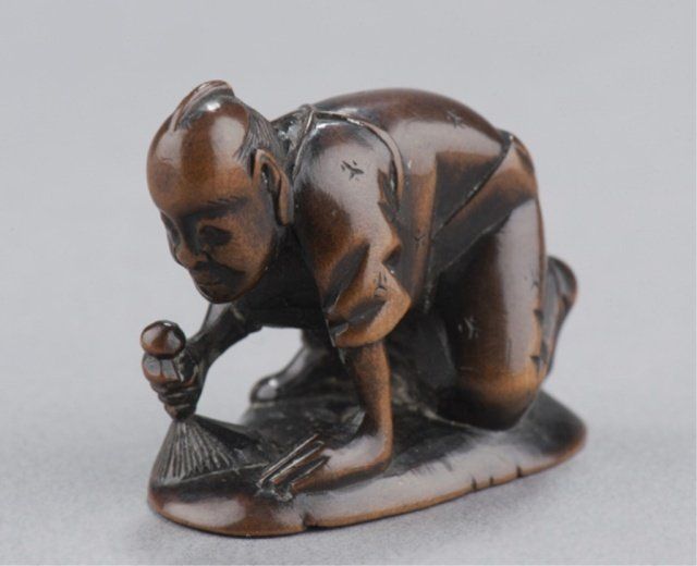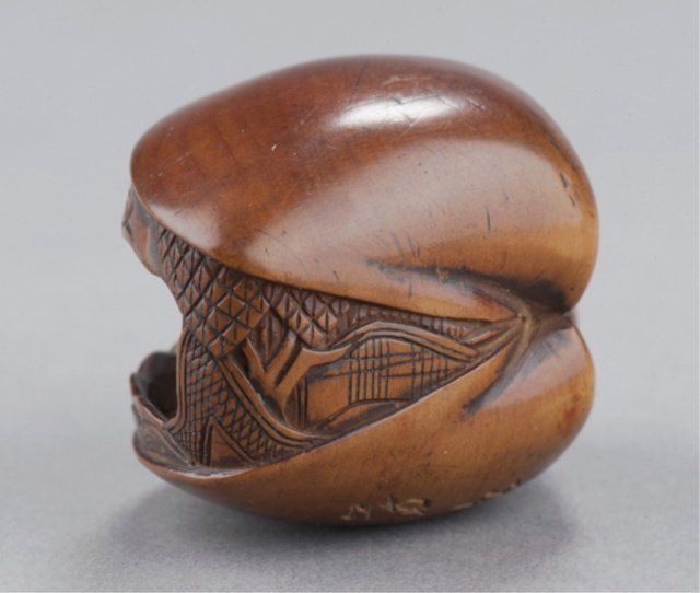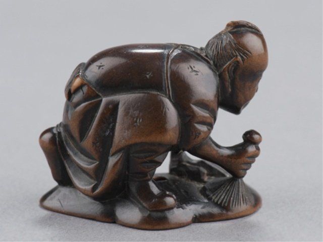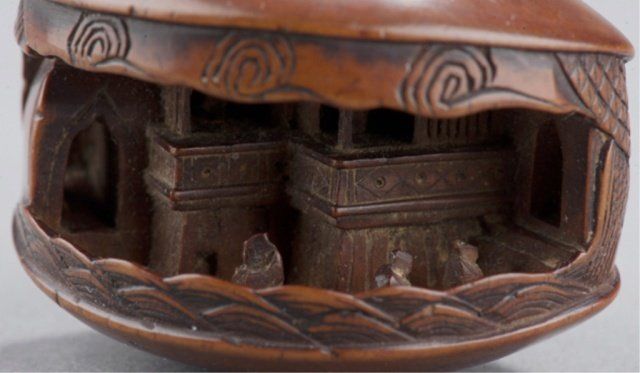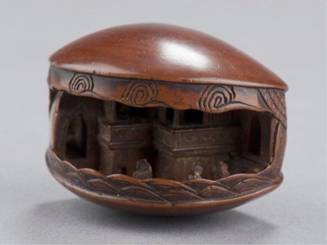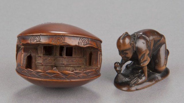 Mid 19th century. The first, temple scene in a clamshell, has cloud patterns along the top and wave patterns along the bottom, inside are two temple porticos and three small figures. A later added signature on the top. 1 3/8in (3.5cm). The second, by Masabumi, a man kneeling to polish a curved object which is the base of the netsuke and forms the character 'kokoro'. Signed on the underside, Masabumi. Provenance: The second, Illustrated in Lazarnick page 699.