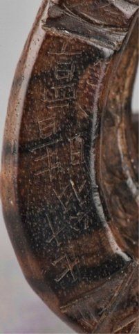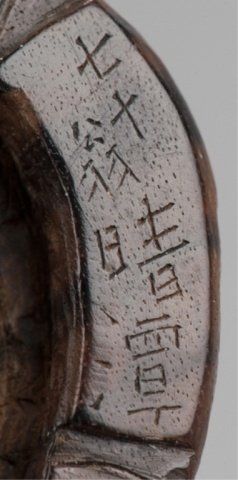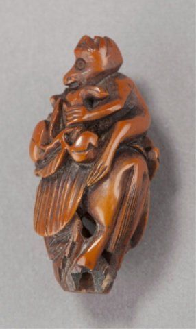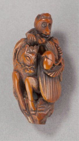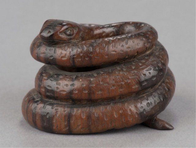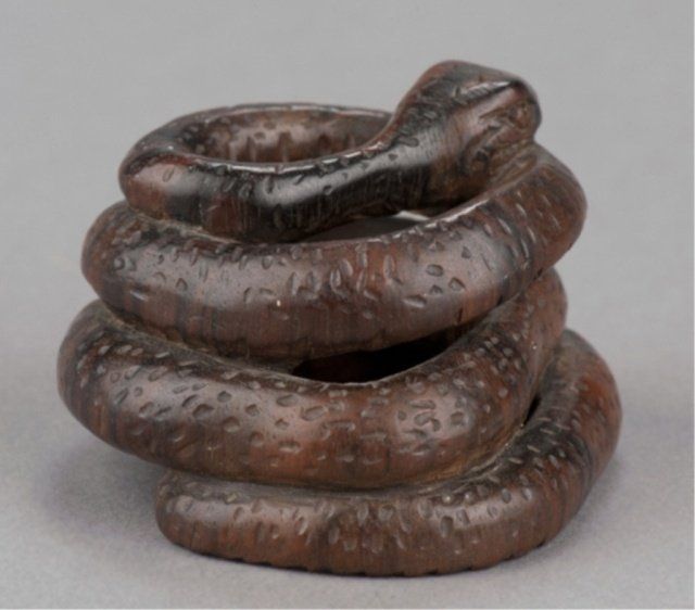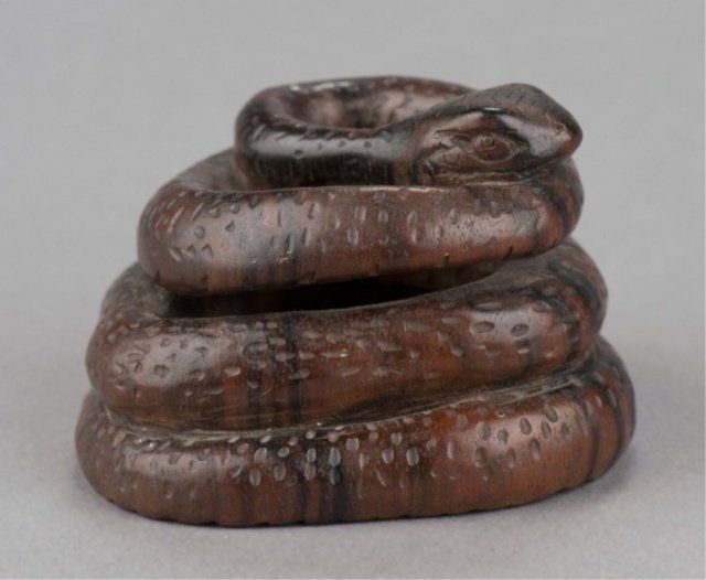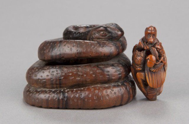 Mid 19th century. The first, by Seitan, a wood mingei netsuke of a loosely coiled snake, the eyes inlaid with metal. Possibly kaki wood. Inscribed, Shichi Ju O Seitan. 1 5/8in (4.2cm). The second, a nut carving of Iba Shingen, a Monkey riding a Horse and carrying a Lotus plant. 1 1/2in (4cm).