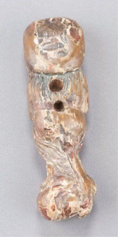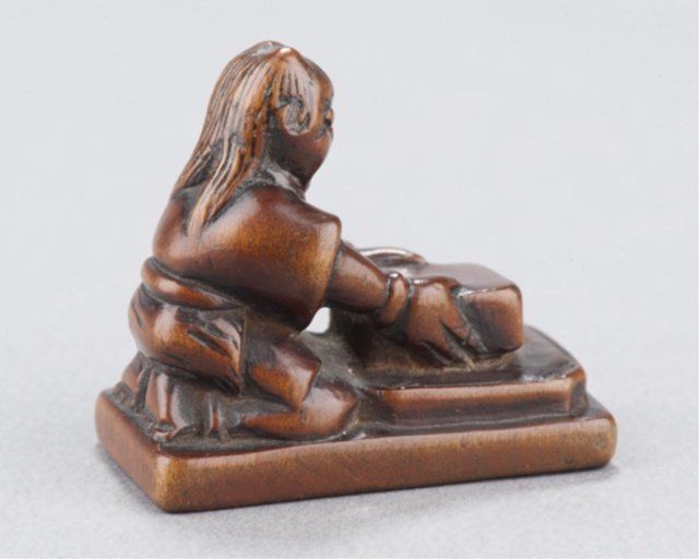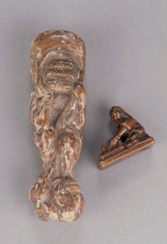 The first, late 18th century. Soken Kisho style figure of Futen, his wind sack held over his head, standing on an Oni, some gesso and magenta-colored lacquer remain on the wood. 4 3/8in (11.2cm). The second, early 19th century, Oni in the role of Daikoku as a rat catcher, he kneels and holds an inverted box which three little rodents can be seen trying to escape. 1 1/4in (3.2cm).