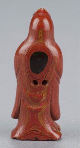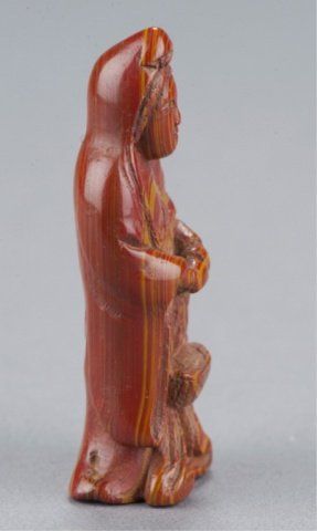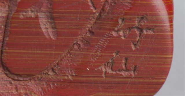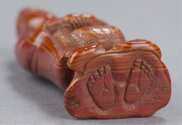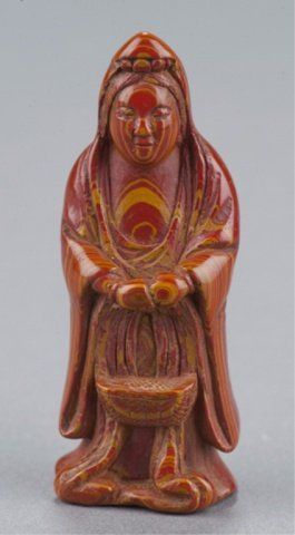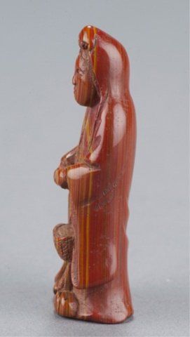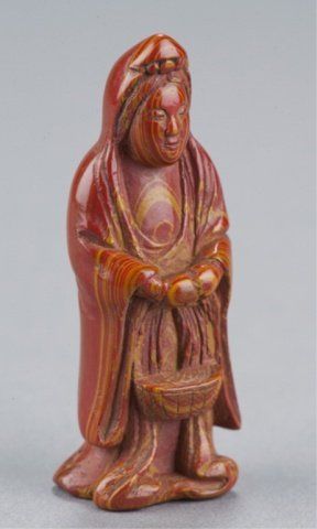Inscribed Chikusen, Tsu, Late 19th century. Standing, carved entirely from red and yellow Guri lacquer. Inscribed on the underside, Chikusen.2 3/8in (6.1cm). Provenance: Purchased from Raymond Bushell 1957.