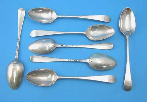 A harlequin set of 6 George III Old English Pattern silver dessert spoons, maker Hester Bateman,...