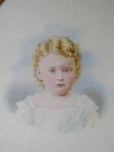 A head and shoulder portrait of a young child - watercolour, oval, in leather case, 22cms x 17cms...