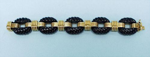 A heavy 18 kt. yellow gold and carved black onyx link bracelet. Circa 1940s. Marked.