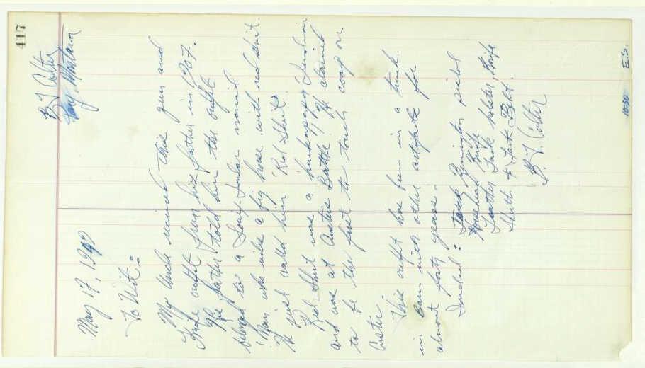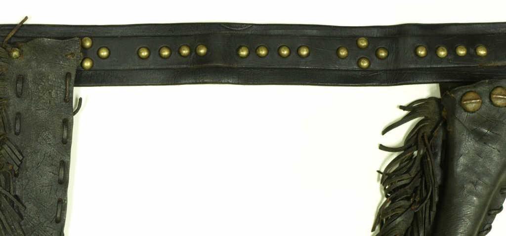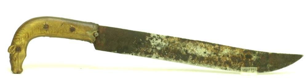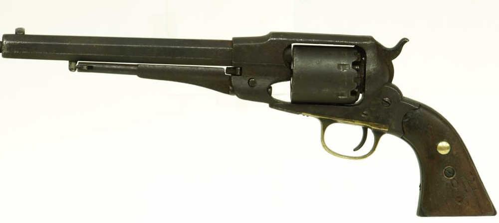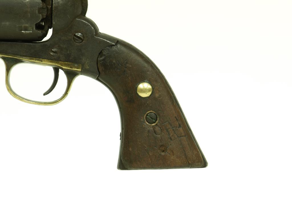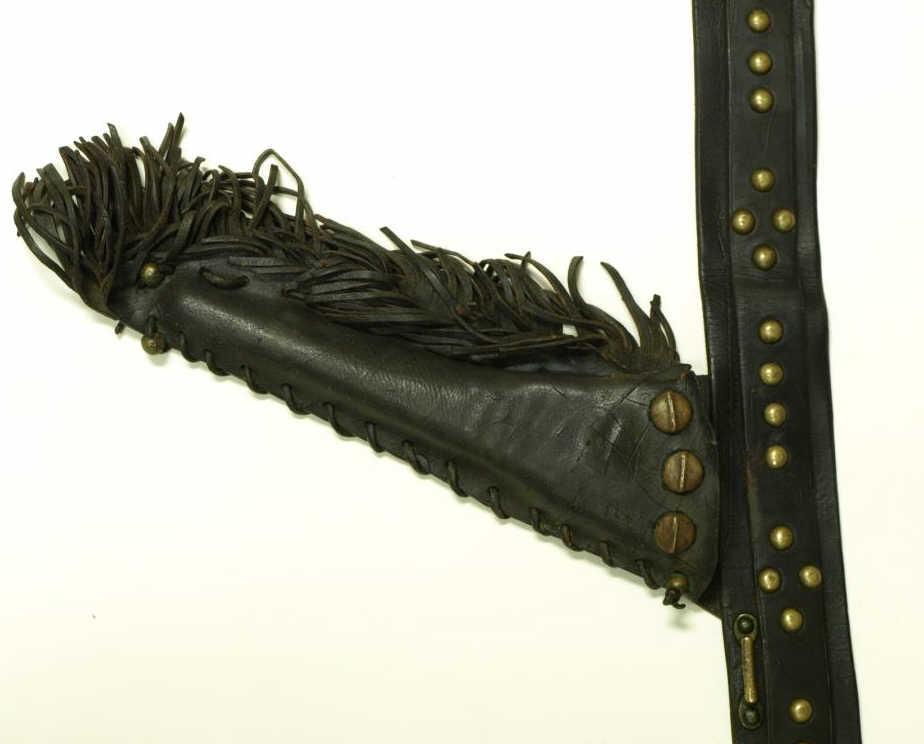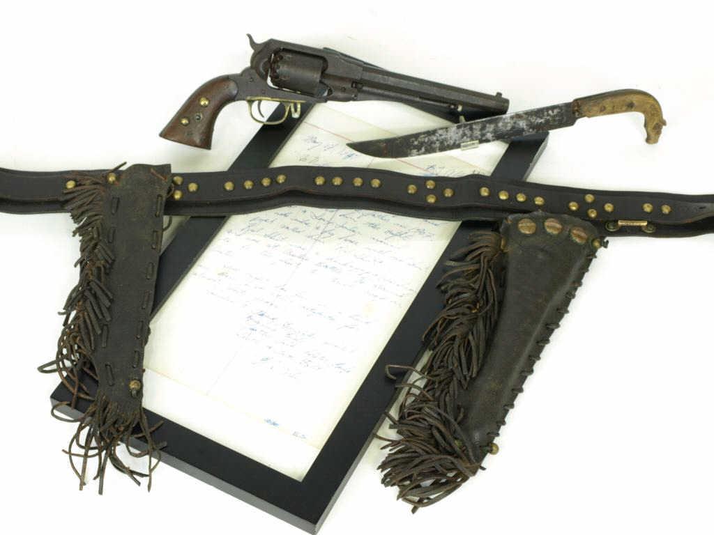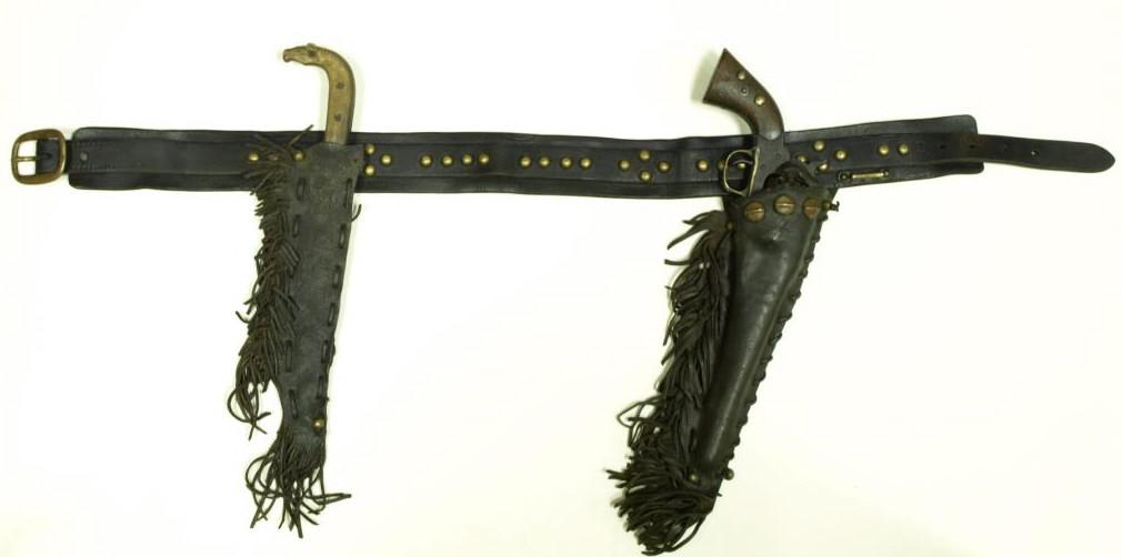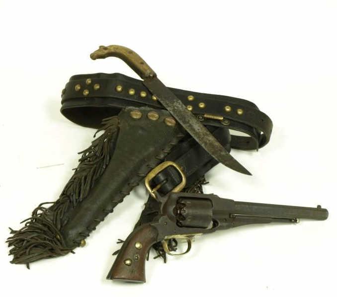 bone handled horse head bowie knife, holster rig and hand written notarized letter giving provenance to Oglala Sioux warrior "Red Shirt". The letter dated May 17th 1947reads "To wit my uncle received this gun and knife outfit from his father in 1907, his father told him the outfit belonged to a Sioux Indian named Man who rides a big horse with Red Shirt. He just called him Red Shirt. Red Shirt was a Hunkapapa Indian and was at Custers battle. He claimed to be the first to touch coop(sic) on Custer. This outfit has been in a trunk in barn with other artifacts for almost 40 years, included... tack Remington pistol, horse head knife, leather tack holster, knife sheath and tack belt. Signed BJ Colter Pony Montana. The letter on lower right corner has state of Montana notary seal stamped to it, the notary Ed Scharnikow. with the time of 10:30 and his initials ES written below the seal. Edward Scharnikow worked at the Morris Bank in Pony Montana. Pony Montana was discovered in the 1870's as a mining town that once had a population of over 1000 but is now nearly a ghost town with under 100 residence. Many of the building are still standing including the Morris Bank. Much history surrounds Red Shirt including his involvement in the battle of Little Big Horn (or not) depending on various historians. Red Shirt went on to work in the Bill Cody's Wild West Show and later died in 1925. The revolver a Remington New Model Army .44 cal. SN 66463 shows a deep dark brown patina with moderate surface pitting, walnut grips having been tacked, the left side with crudely engraved five point star and rolling log design, the action functioning however cylinder doesn't rotate. Carved horse head knife measures 13 1/2", lower portion of handle has chipped away, the blade with heavy scattered surface erosion and rust. The leather belt with heavy brass unmarked buck, decorated with 29 brass spots, one missing. Holster heavily fringed as is knife sheath, the belt showing a portion of an old makers cartouche. Obviously made from old harness or saddle. An overall interesting rig that was purchased from the nephew of the said BJ Colter.