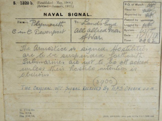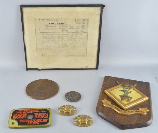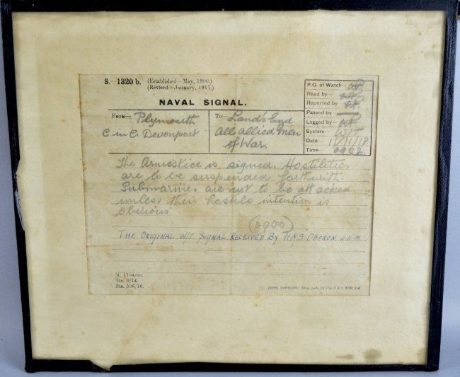 A historic WWI Naval Signal from Plymouth C in C Devonport to Land's End all allied men of War stating the armistice is signed and hostilities are to be suspended, dated 11/11/18 09.52, read, reported, and logged by W.P., This was the original W/T signal received by HMS Oberon 11.11.18, WWI Bronze Death Plaque for Walter Wingate Primrose, a Lusitania Medallion, a wall plaque, two brass badges & a Mirror Signalling-Mark Provenance: Consigned by the family of Lord Provost John Ure Primrose.